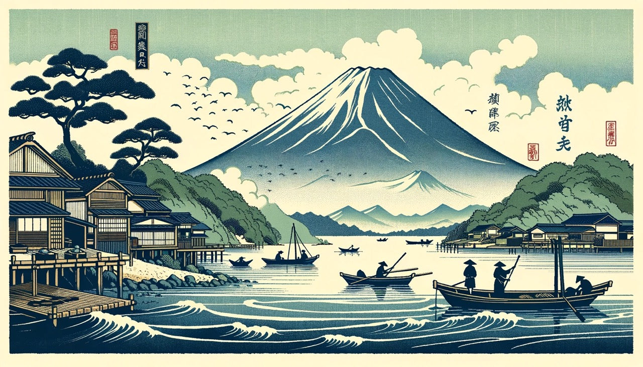 Ce papier peint paysage japonais capture la beauté intemporelle du mont Fuji dans le style traditionnel ukiyo-e. Le majestueux sommet enneigé s'élève au-dessus d'une scène de lac tranquille, où des bateaux de pêche dérivent sur des vagues douces. Des tons bleu-vert riches se mêlent à des nuages ivoire doux, tandis que des maisons japonaises traditionnelles parsèment le rivage sous des pins sombres. Ce papier peint mont Fuji équilibre habilement un travail de pinceau détaillé avec un espace négatif serein, créant une composition magistrale qui rend hommage à l'art japonais classique.