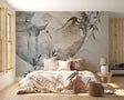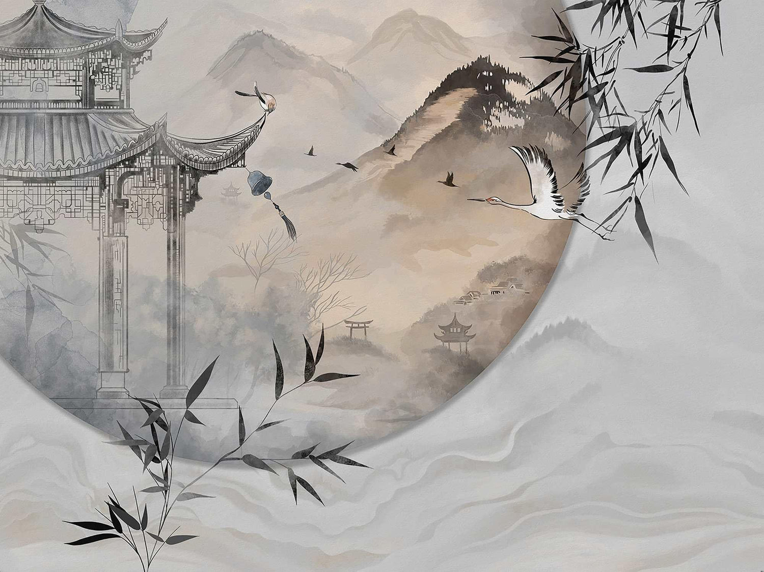 Ce papier peint paysage japonais capture la beauté éthérée d'un paysage montagneux asiatique traditionnel dans des tons doux et brumeux. Des grues gracieuses planent à travers les nuages contre des sommets majestueux, tandis que de délicates feuilles de bambou encadrent la composition. Le papier peint pagode orientale détaillé présente des éléments architecturaux complexes rendus en nuances de gris sophistiquées, créant un contraste saisissant avec les éléments naturels. La palette douce de beige et de gris évoque l'essence tranquille des peintures à l'encre traditionnelles.
