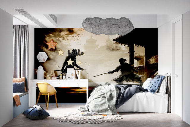 Cette peinture murale samouraï capture une scène de bataille épique sur fond d'architecture japonaise ancienne. Les silhouettes dramatiques des guerriers engagés dans le combat créent un point focal puissant, tandis que le ciel aux tons sépia et les silhouettes des temples évoquent un sentiment de mystique intemporelle. Le papier peint de bataille japonais équilibre magistralement lumière et ombre, avec des teintes dorées illuminant les nuages turbulents et les feuilles éparses dansant au vent.