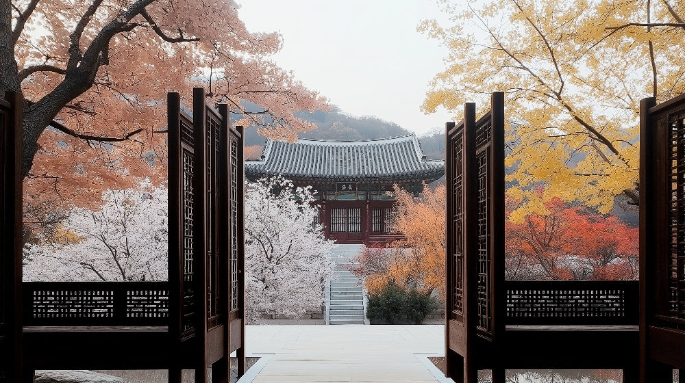 Ce papier peint de temple japonais capture la beauté éthérée d'un sanctuaire asiatique traditionnel encadré par la plus enchanteresse des expositions saisonnières de la nature. Des portes en bois sombre ornées de motifs géométriques complexes s'ouvrent pour révéler une vue sereine du temple, tandis que les cerisiers en fleurs aux teintes douces de blanc et de corail créent un auvent de rêve aux côtés du feuillage doré de l'automne. Le toit courbé du temple et les marches en pierre ajoutent une grâce architecturale à cette composition paisible.
