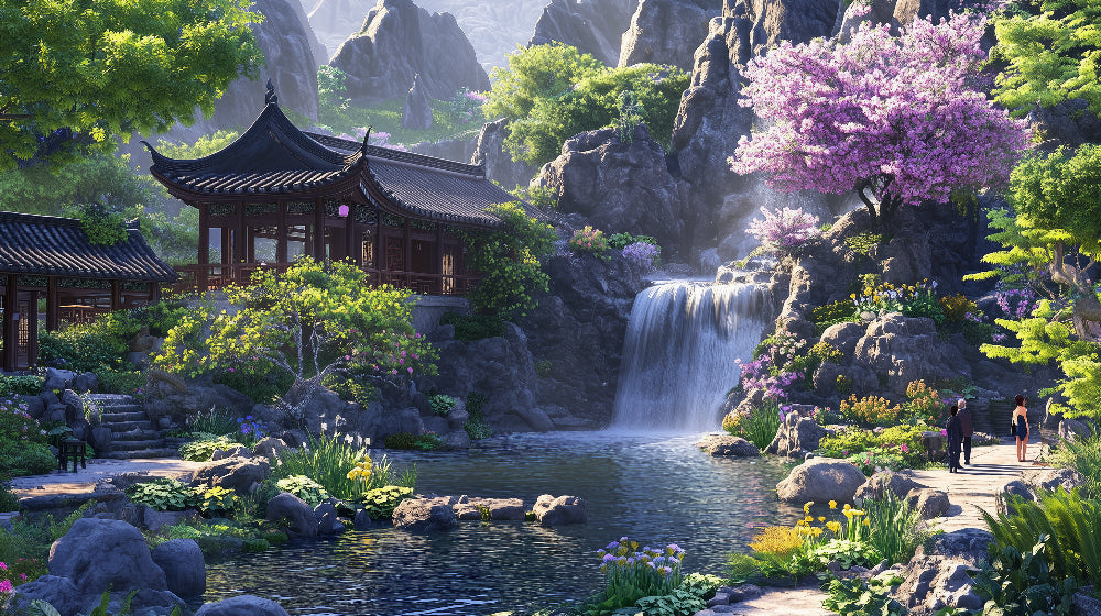 Papier Peint Mural Jardin Japonais | Cascade de Montagne avec Fleurs de Cerisier