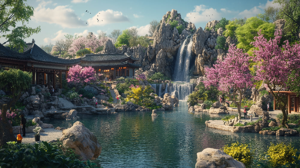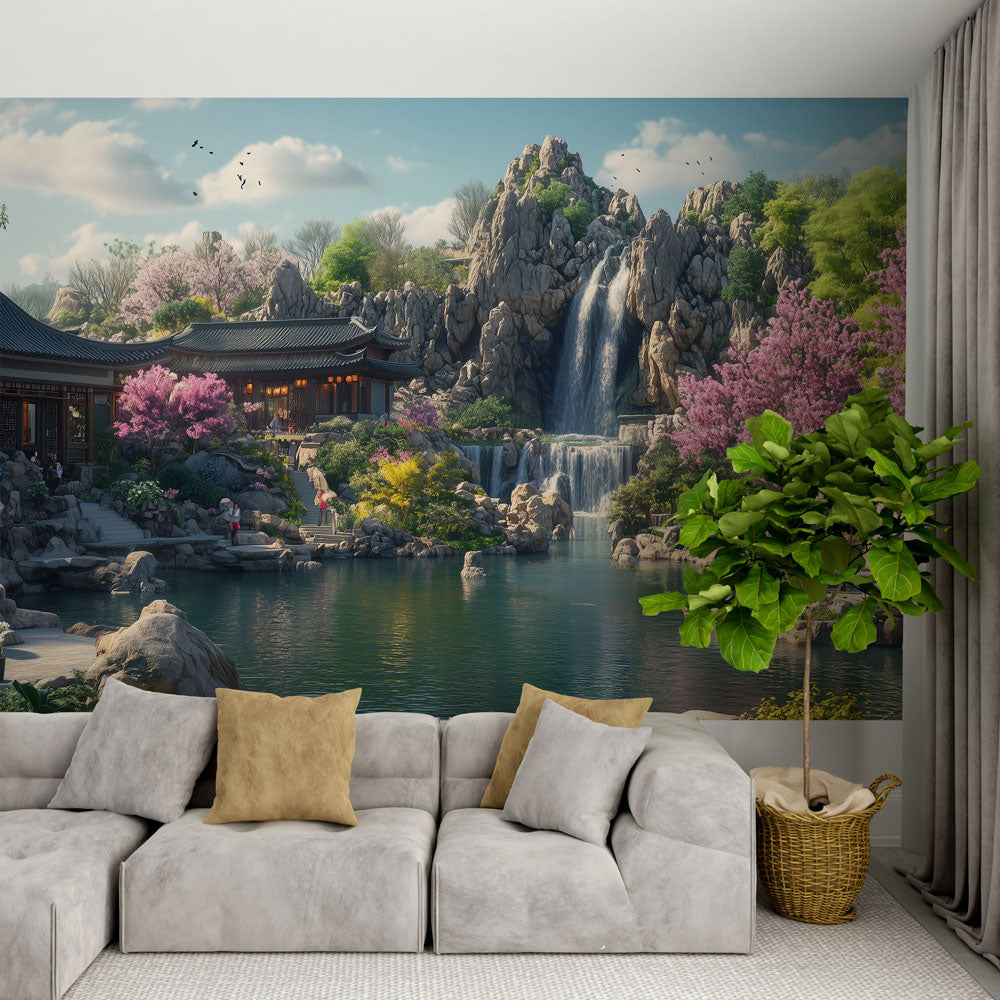 Papier Peint Mural Jardin Japonais | Cascade de Montagne avec Fleurs de Cerisier