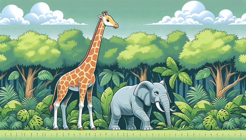 Ce papier peint animaux de la jungle donne vie à une scène de safari enchanteresse avec son illustration charmante de style cartoon. Une girafe amicale avec des motifs détaillés couleur miel se tient gracieusement aux côtés d'un éléphant gris doux, tous deux placés devant un décor luxuriant de feuillage tropical. La canopée verte vibrante de la forêt et le design de papier peint safari présentent des feuilles de monstera et des palmes, créant de la profondeur tandis que des nuages blancs duveteux dérivent à travers un ciel vert menthe serein.