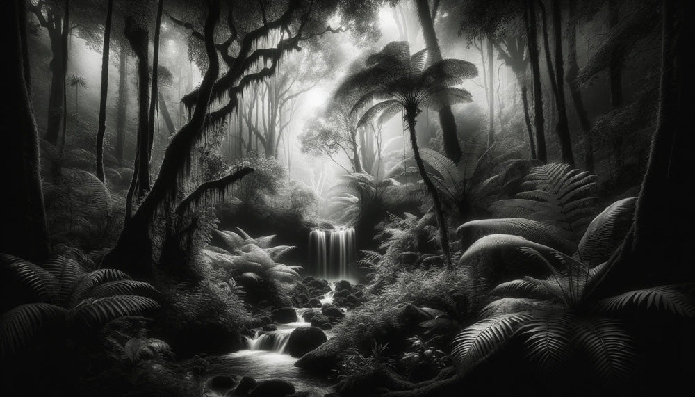 Ce papier peint jungle tropicale capture l'essence mystique d'un paradis caché, où une cascade sereine s'écoule à travers des pierres anciennes couvertes de mousse. La palette monochrome apporte une profondeur dramatique à la scène, avec des palmes de palmier imposantes et des vignes torsadées créant des couches de détails complexes. Une brume éthérée se faufile à travers le papier peint forêt en noir et blanc, projetant une atmosphère onirique sur le paysage exotique parsemé de fougères délicates et d'arbres tropicaux majestueux.