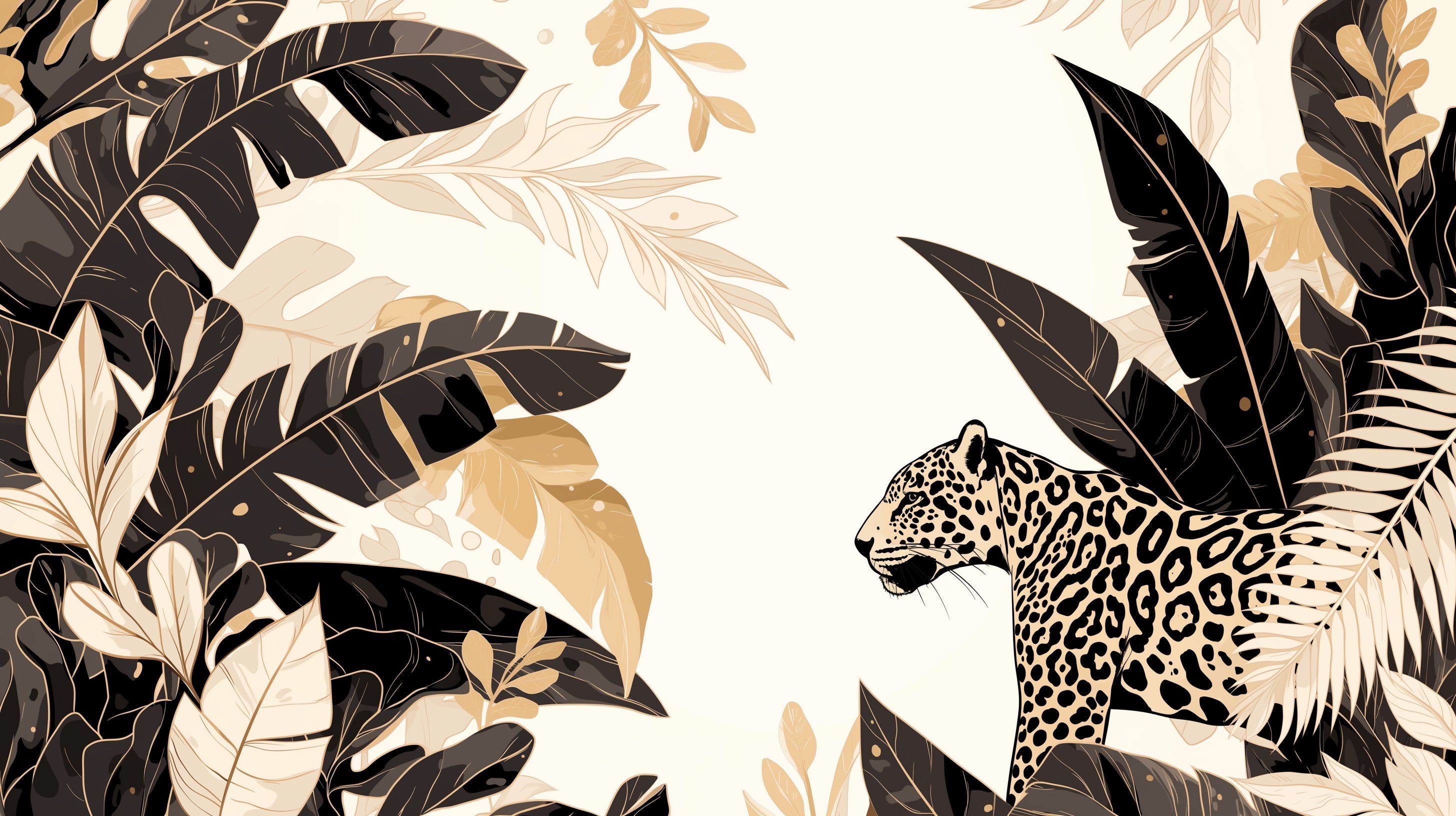 Ce papier peint léopard tropical présente un mélange magistral d'art moderne et d'élégance sauvage. Des feuilles de palmier noires dramatiques créent une silhouette audacieuse sur un fond ivoire immaculé, tandis que des éléments botaniques beiges ajoutent une chaleur subtile. Le point central de ce papier peint animalier de jungle met en scène un léopard majestueux rendu avec un détail minutieux, son pelage tacheté créant un motif naturel qui capte l'attention tout en conservant une retenue sophistiquée.
