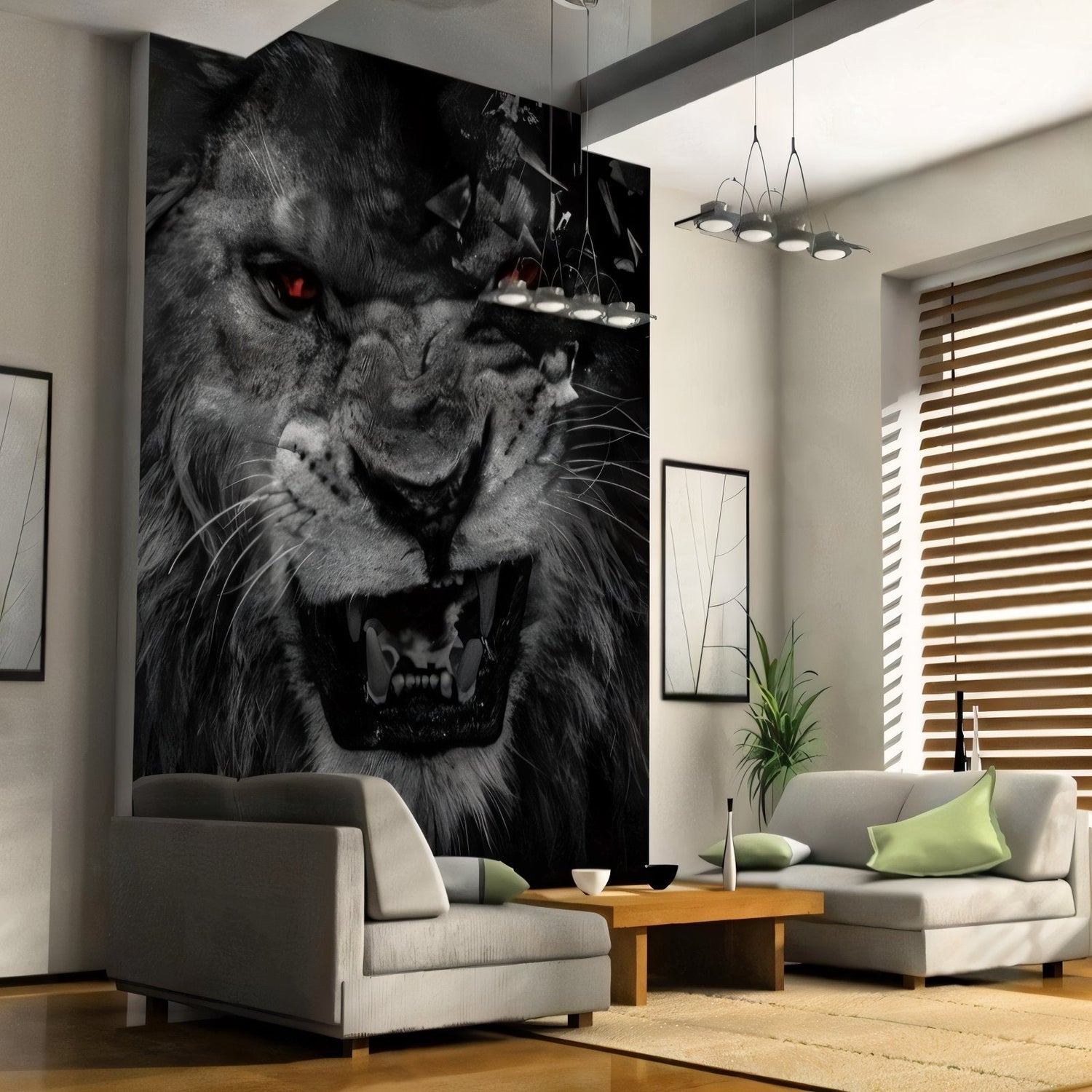 Ce papier peint lion noir et blanc saisissant met en valeur la puissance brute et la majesté du prédateur ultime de la nature. Le design monochromatique dramatique présente un gros plan intense du visage d'un lion, avec des yeux rouges perçants qui créent un point focal hypnotisant. Le détail exceptionnel capture chaque mèche texturée de la magnifique crinière, tandis que la fresque murale lion féroce combine photographie artistique et contraste dramatique pour créer un impact visuel saisissant.