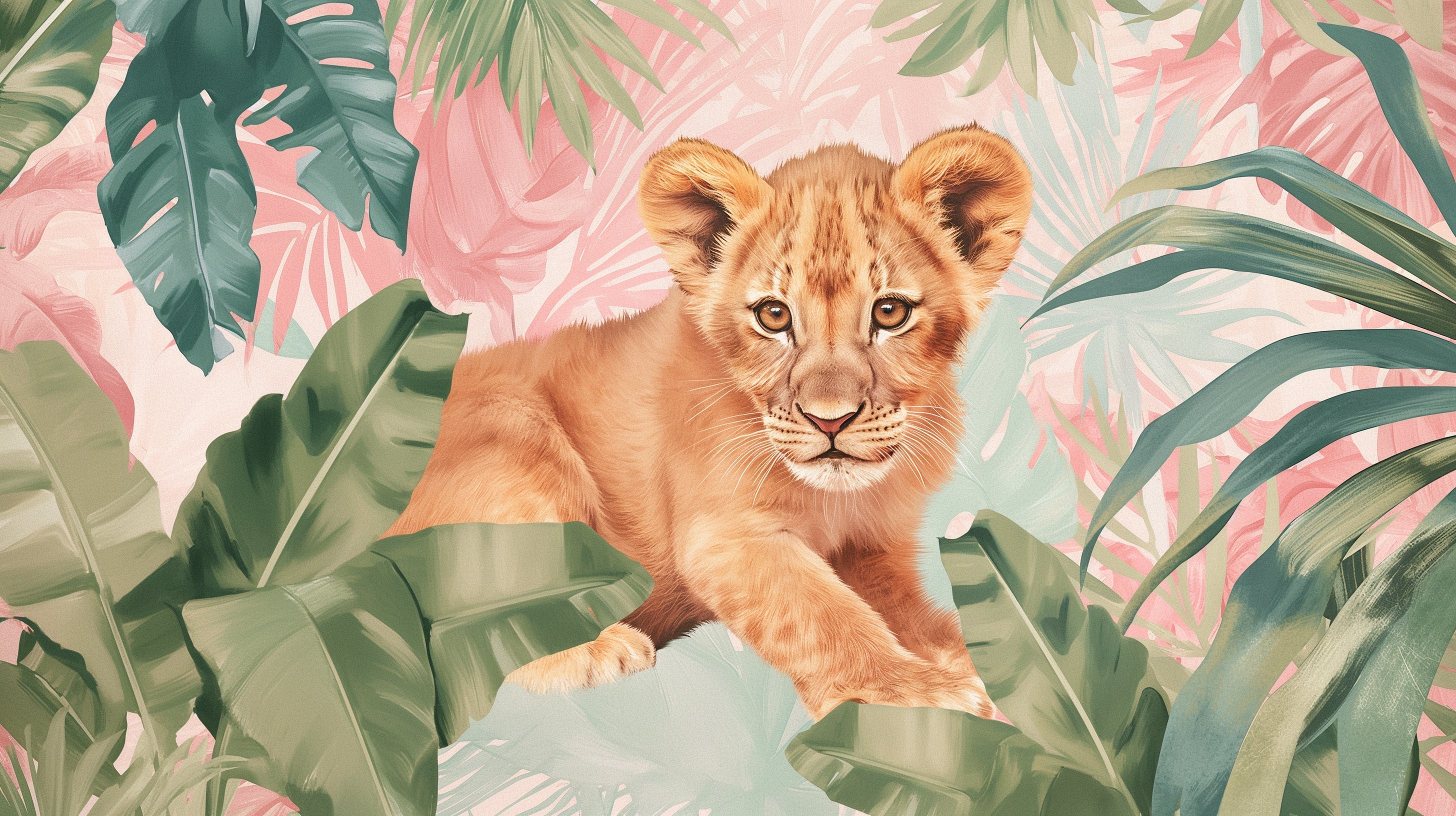 Papier Peint Mural Lionceau | Safari Tropical Rose et Vert
