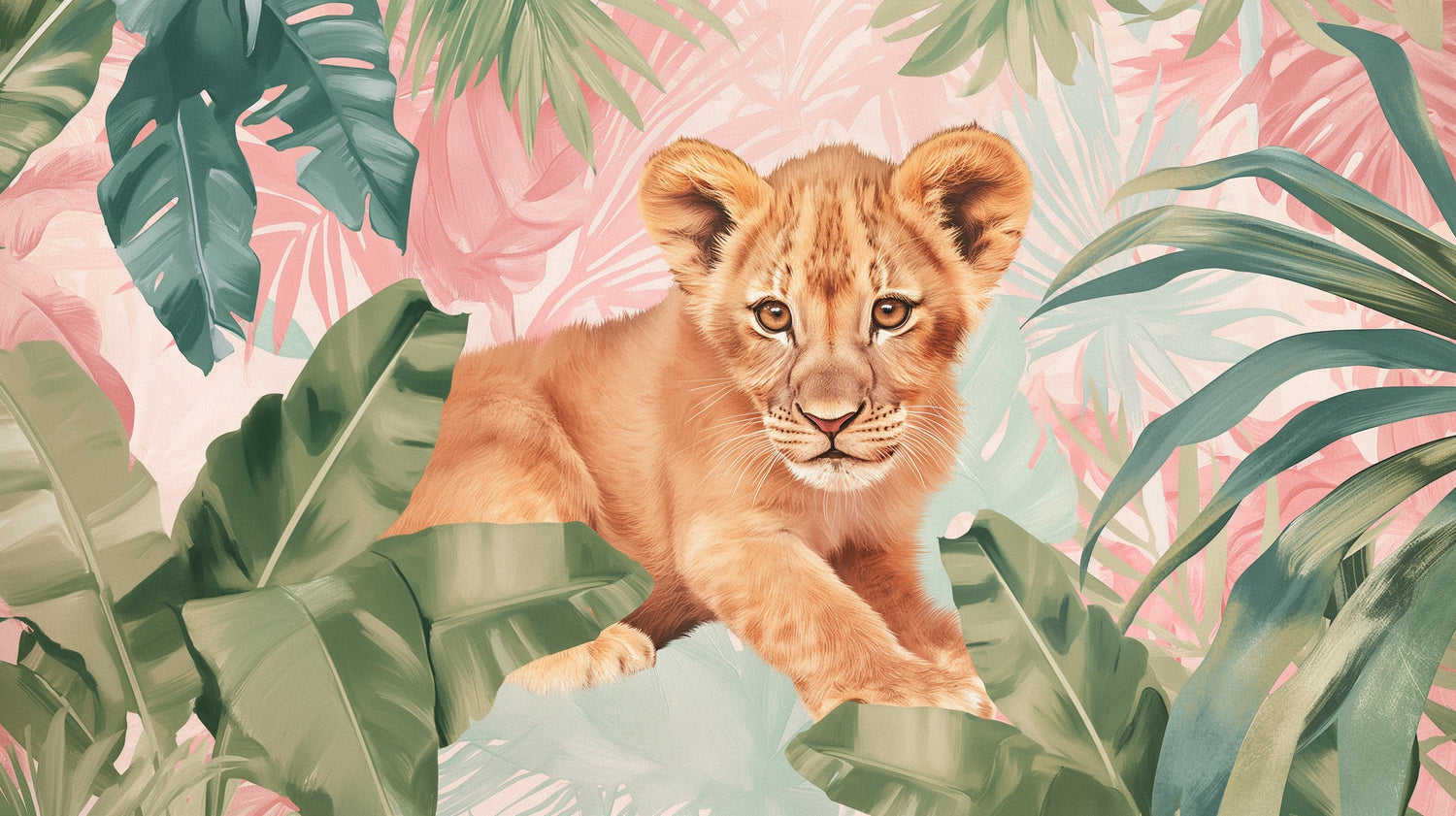 Ce papier peint lionceau safari crée une scène enchanteresse où un jeune lion émerge d'un feuillage tropical luxuriant. Sur un fond rose doux, l'illustration détaillée met en valeur l'expression douce du lionceau et sa fourrure dorée, tandis que les feuilles de monstera vert émeraude et les palmes créent un décor de jungle onirique. Le papier peint animalier tropical combine des teintes pastel douces avec des tons naturels riches, créant une esthétique sophistiquée mais ludique.