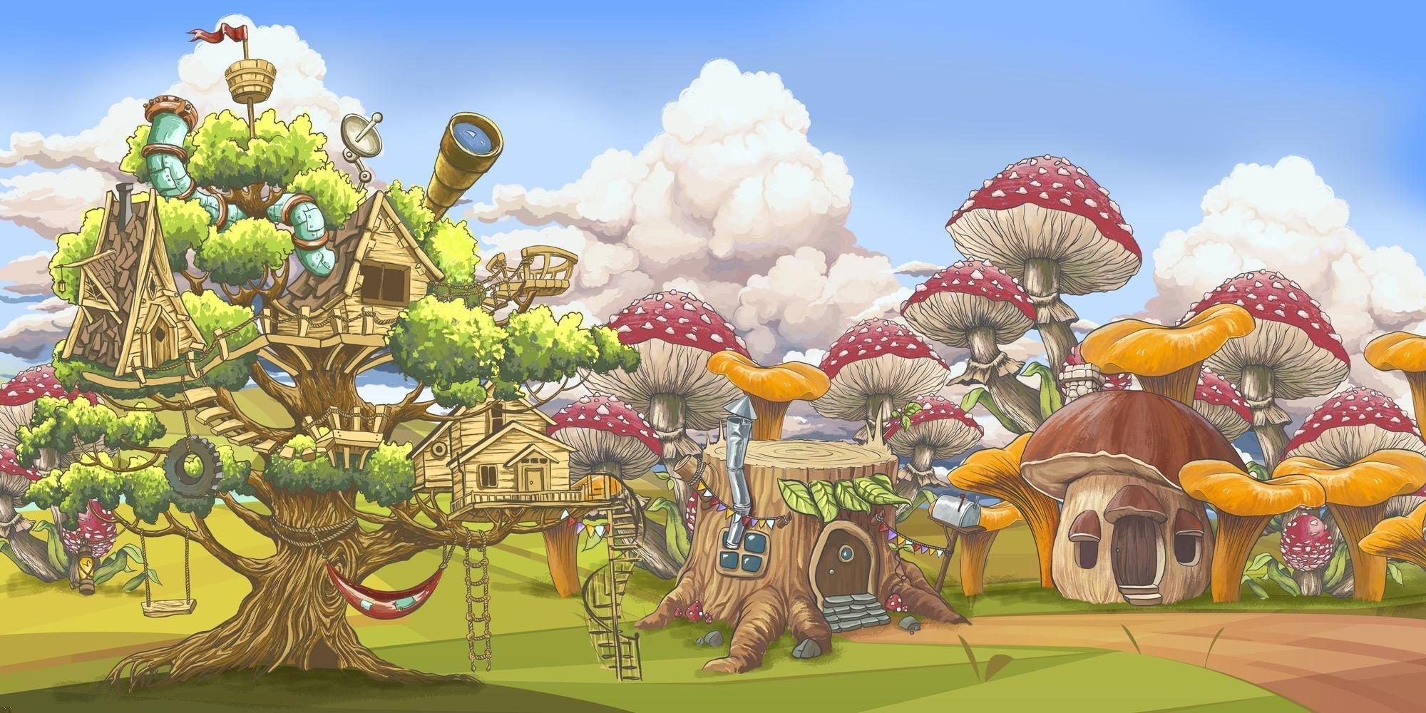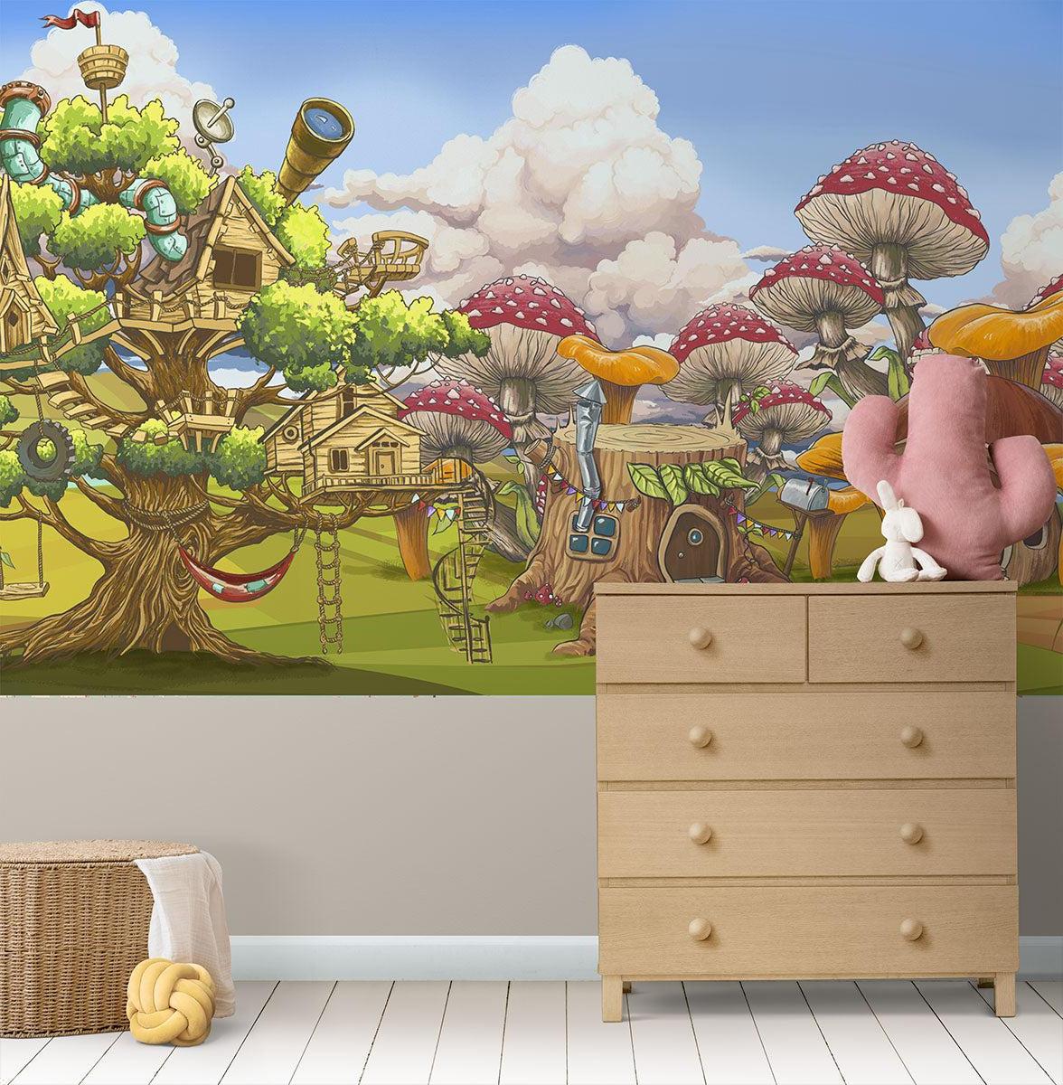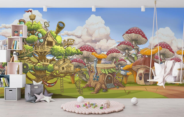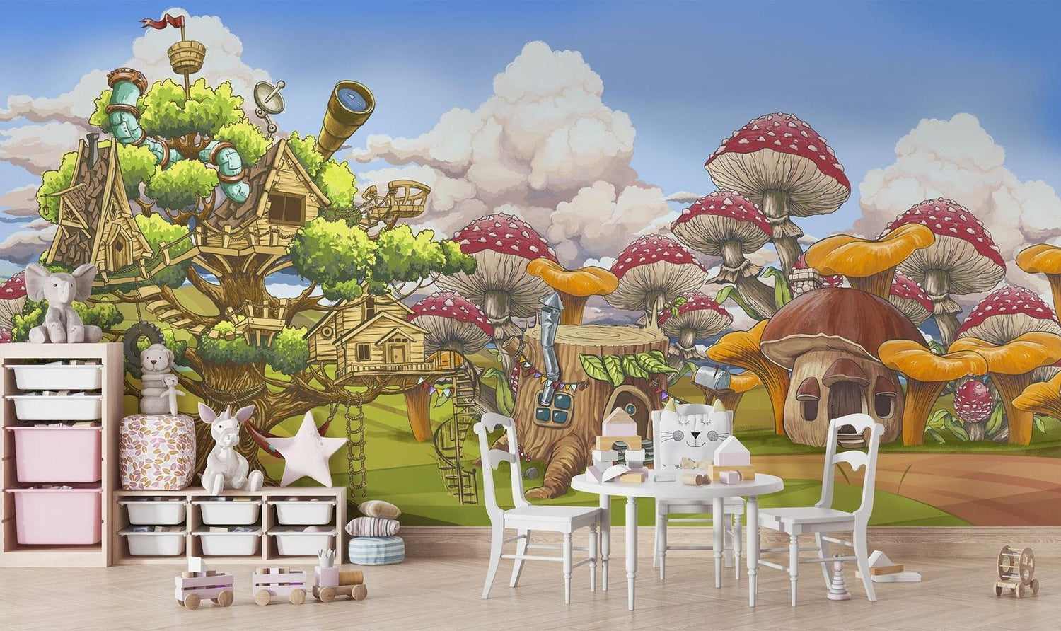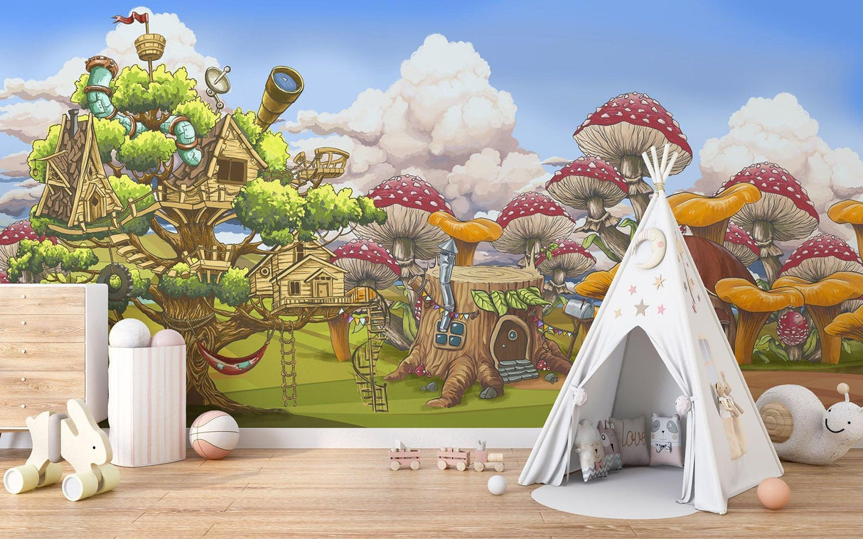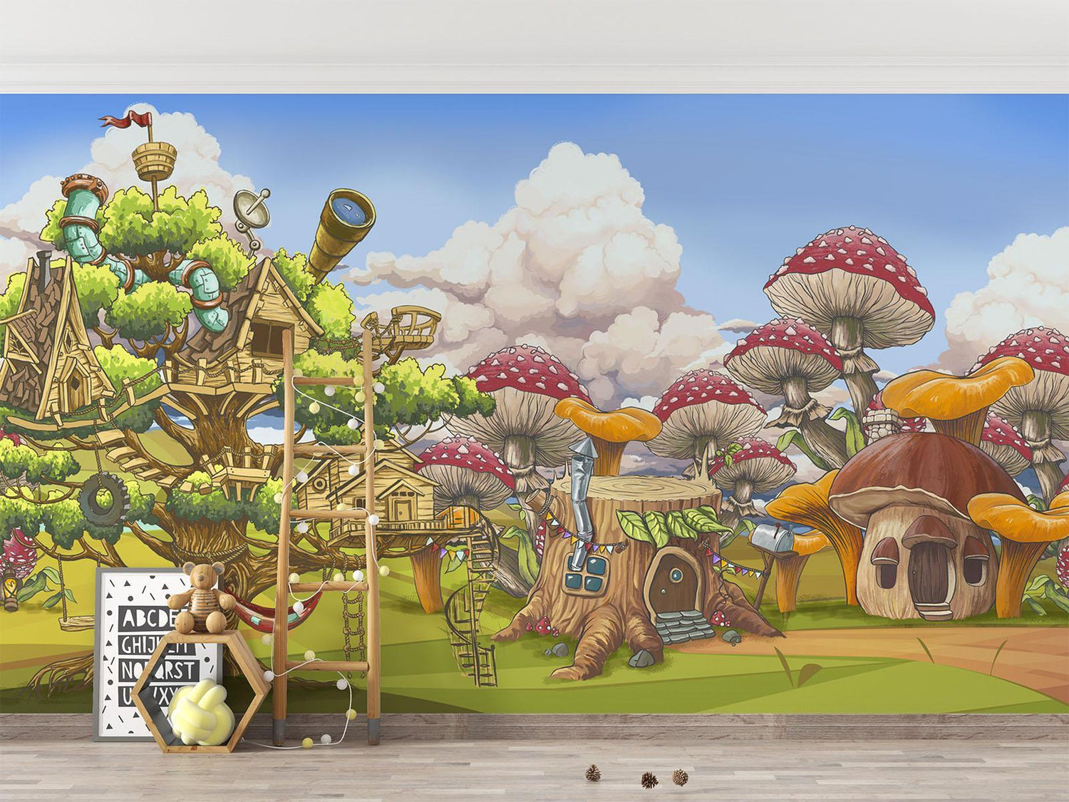 Papier Peint Mural Cabane Fantaisie | Aventure Forêt Magique aux Champignons