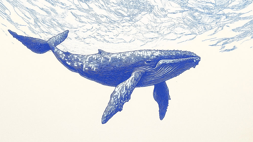 Ce papier peint baleine bleue présente une magnifique créature marine rendue avec un détail saisissant en art linéaire. La baleine à bosse bleu profond s'écoule sur un fond blanc net, son corps texturé orné de motifs délicats et de marques naturelles. Un travail de ligne gracieux capture le mouvement des vagues de l'océan au-dessus, créant une fresque murale marine qui allie précision artistique et grandeur naturelle.