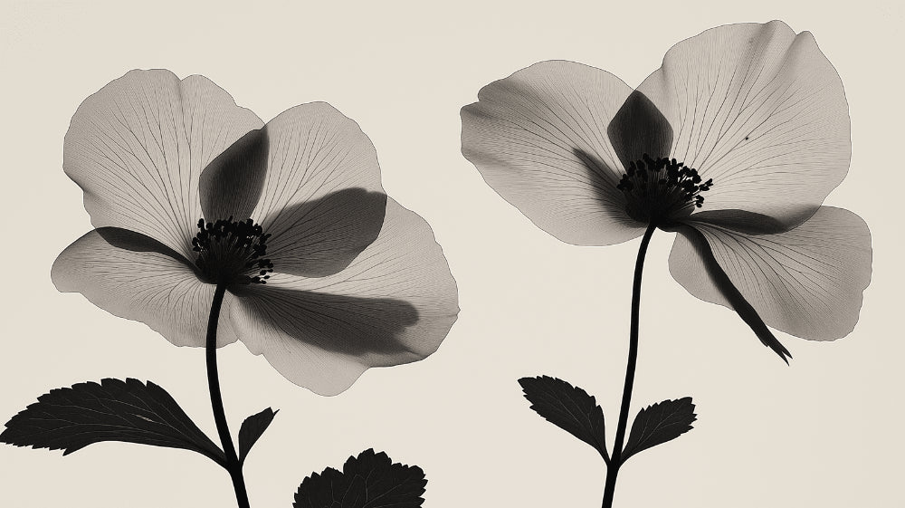 Ce papier peint floral noir et blanc présente de magnifiques fleurs de bégonia rendues en tons monochromatiques saisissants. Les pétales translucides semblent flotter sur un fond beige doux, créant un effet radiographique éthéré qui révèle chaque veine et texture délicate. La fresque murale botanique capture magistralement le contraste entre les tiges sombres et les pétales de fleurs éthérés, présentant l'architecture de la nature sous sa forme la plus artistique.
