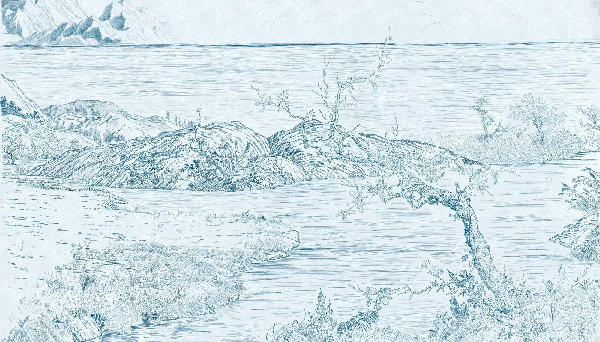 Papier Peint Mural Lac de Montagne | Paysage en Ligne Bleue Délicate
