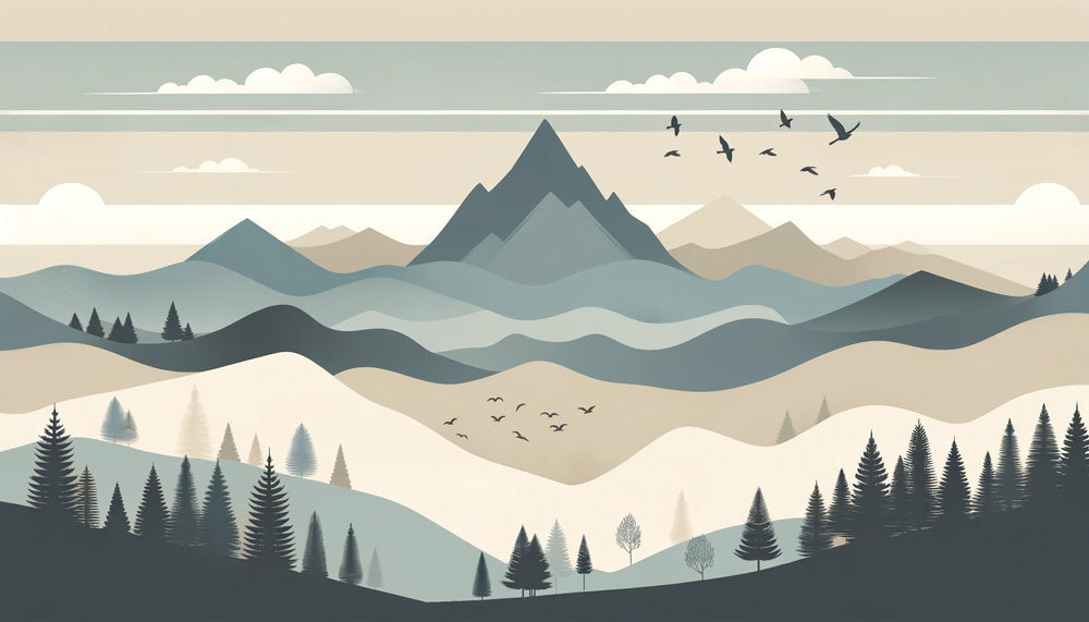 Ce papier peint paysage de montagne capture l'essence de la sérénité nordique à travers une composition magistrale de sommets ondulants et de vallées brumeuses. Le mélange harmonieux de tons vert sauge, beige doux et bleu acier crée un effet de dégradé sophistiqué, tandis que de délicates forêts de pins parsèment le premier plan. Des oiseaux en vol et des nuages légers ajoutent un mouvement dynamique à ce papier peint panoramique de montagne, créant une scène de nature sauvage immaculée.