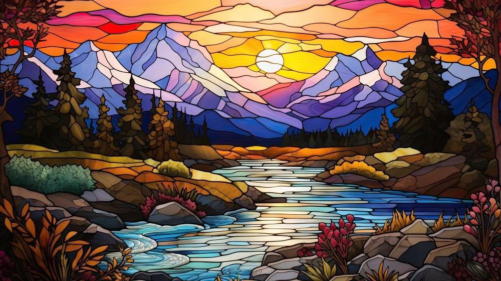 Papier Peint Mural Montagne | Paysage Coucher de Soleil en Vitrail