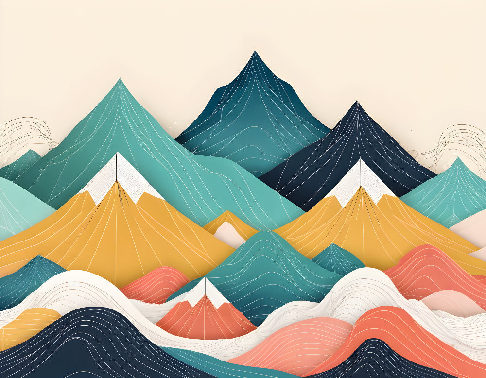Ce papier peint montagne abstrait présente un paysage géométrique fascinant où les sommets s'élèvent en couches harmonieuses de tons bleu sarcelle, or et corail. Le design aux lignes épurées met en scène des sommets enneigés contre des courbes douces et des contours fluides, créant une interprétation moderne d'une fresque murale de chaîne de montagnes. Chaque pic est soigneusement rendu avec des détails linéaires délicats, alliant précision architecturale et fluidité artistique.