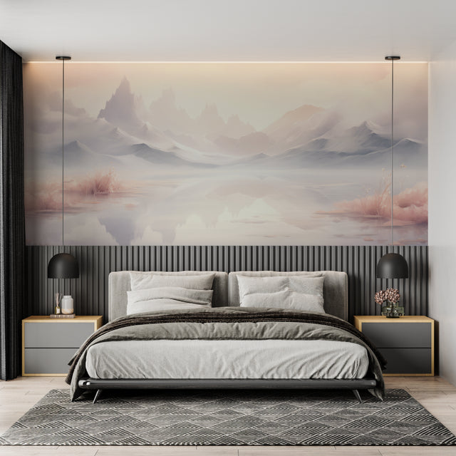 Les couleurs douces de ce papier peint panoramique vue sur le lac font des merveilles sous n'importe quel éclairage.