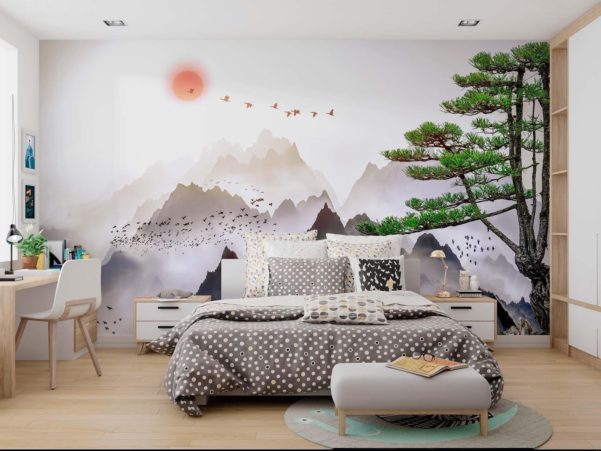 Ce papier peint paysage de montagne capture l'essence de l'art japonais avec sa composition éthérée. Des pins majestueux se dressent en sentinelles dans un vert émeraude vibrant, tandis que les sommets brumeux des montagnes s'estompent dans des horizons gris doux. Un soleil aux teintes corail projette sa lueur chaude sur la scène tandis que des oiseaux prennent leur envol en formation gracieuse, créant un papier peint nature japonaise qui incarne la sérénité et le mouvement en parfait équilibre.