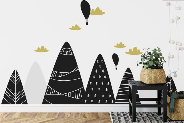 Cette fresque murale de montagne présente une interprétation moderne saisissante des sommets montagneux rendus en silhouettes audacieuses noires et grises douces sur un fond blanc net. Chaque sommet arbore des motifs géométriques uniques, allant de tourbillons ludiques à des rayures nettes et des motifs délicats de pins, créant un papier peint montagne scandinave qui équilibre sophistication et fantaisie. Des nuages dorés et des montgolfières charmantes flottent au-dessus des sommets, ajoutant du mouvement et une touche de charme magique à la composition.