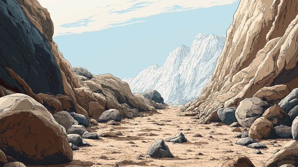 Ce papier peint paysage de montagne capture la majesté brute de la nature où le terrain accidenté rencontre des sommets immaculés. La composition vous entraîne à travers une vallée rocheuse dramatique, où des rochers chauffés par le soleil aux tons terreux riches créent un chemin naturel menant à des montagnes enneigées. Le papier peint montagne désertique met en valeur un contraste remarquable entre les bruns chauds des rochers usés par le temps et le blanc éclatant des sommets lointains, le tout sur un ciel bleu serein parsemé de nuages légers.