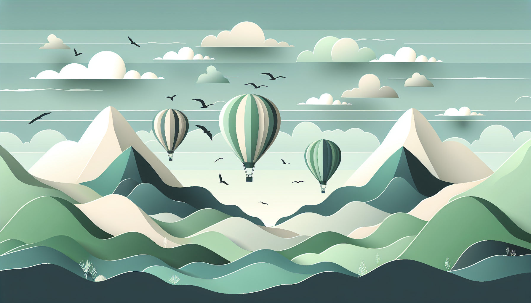 Ce papier peint mural montgolfière capture un paysage montagneux serein dans des tons apaisants de vert menthe. Le design présente trois ballons rayés flottant gracieusement contre un ciel parsemé de nuages, tandis que des sommets majestueux enneigés s'élèvent au-dessus de collines ondulantes en dessous. La composition artistique équilibre formes géométriques et courbes organiques, créant un papier peint aventure en montagne qui apporte à la fois mouvement et tranquillité à la scène.