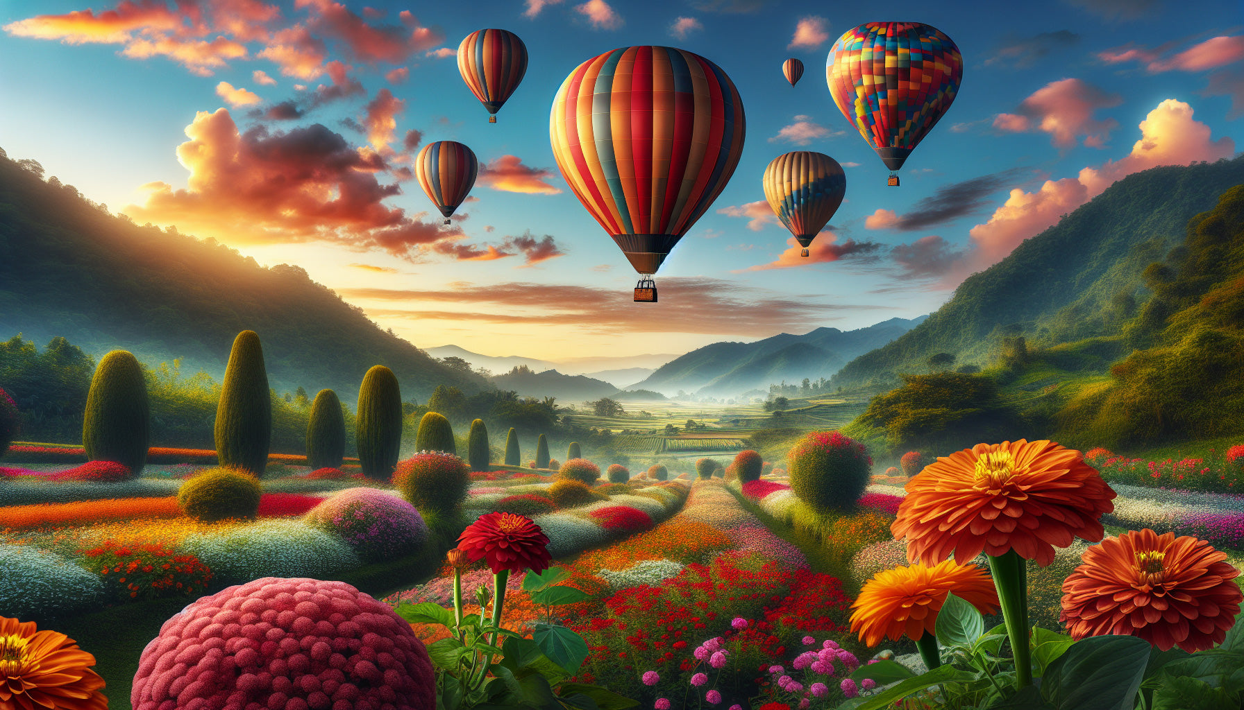 Ce papier peint montgolfière capture une scène de coucher de soleil fascinante où des ballons vibrants dérivent à travers un ciel orange doré. Sur fond de vallées montagneuses brumeuses, le paysage se déploie avec un jardin soigneusement entretenu présentant des arbres topiaires et une explosion de fleurs colorées. Le papier peint paysage panoramique met en valeur de magnifiques dahlias aux rouges profonds et oranges, complétés par de délicates fleurs sauvages aux teintes roses et violettes s'étendant sur des collines ondulantes.