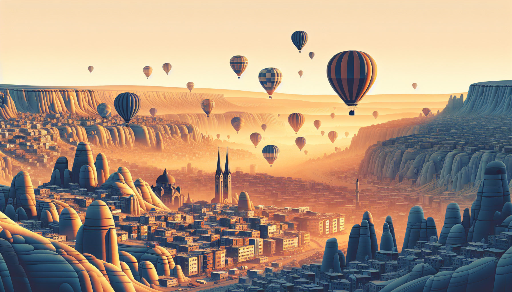 Ce papier peint montgolfière capture un paysage urbain fascinant baigné de teintes dorées-orangées du coucher de soleil, où de majestueuses montgolfières dérivent à travers le ciel chaud. Le paysage architectural en dessous présente des flèches jumelles distinctives et des structures arrondies, créant un mélange unique de fantaisie et de design urbain. Le papier peint ville montagne met en valeur des ombres bleu profond contrastant avec des couleurs de grès touchées par le soleil, tandis que des montgolfières colorées parsèment l'horizon dans une harmonie d'aventure et de sérénité.
