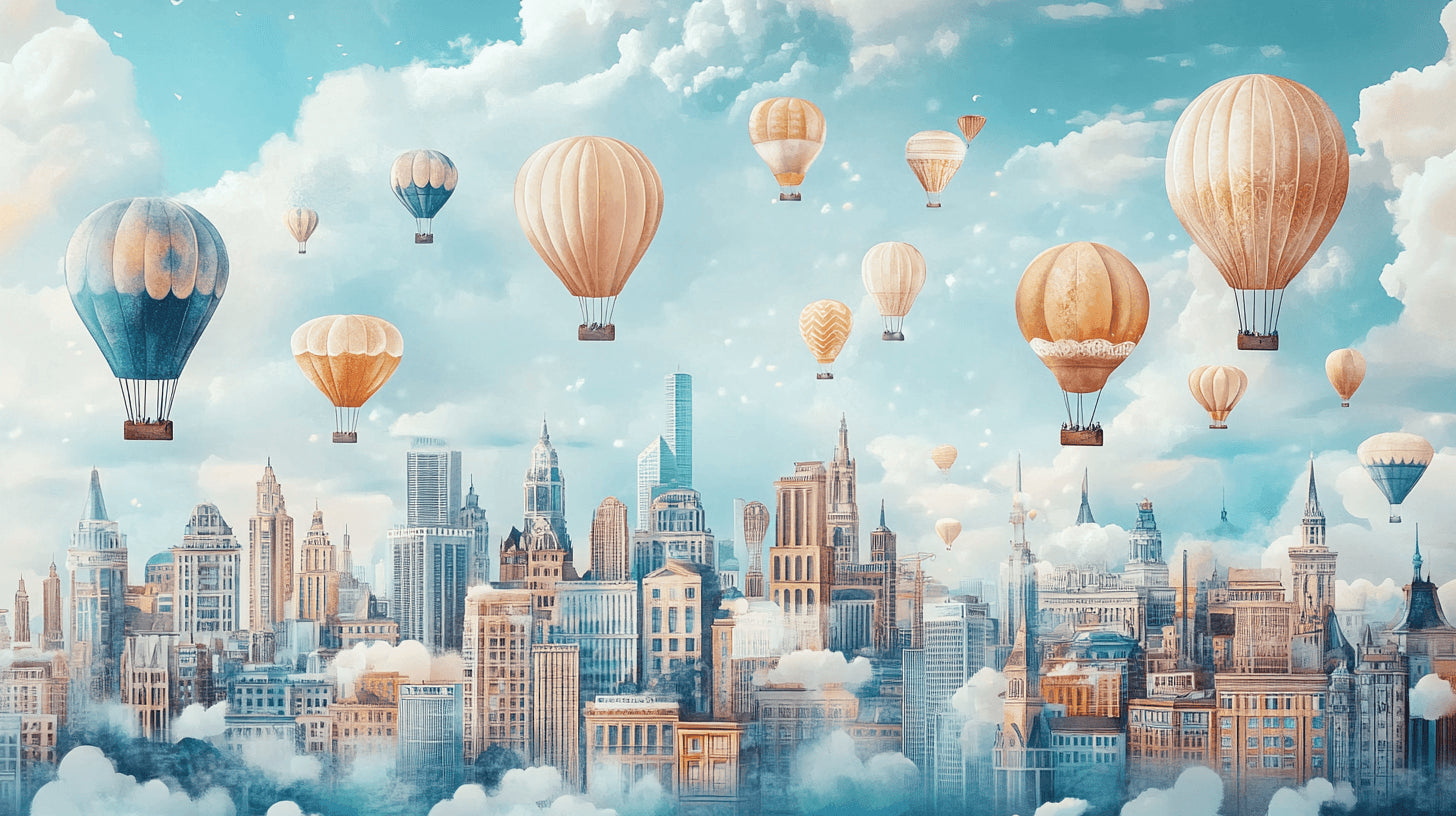 Papier Peint Mural Montgolfière | Horizon de Ville Rêveur avec Ballons Pastel