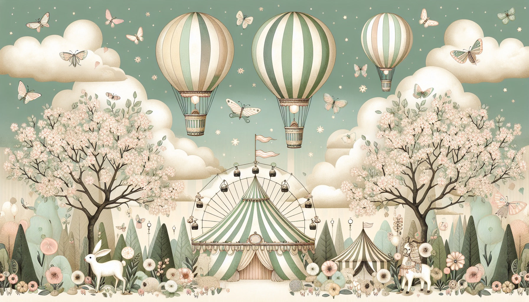 Ce papier peint montgolfière dévoile une scène de fête foraine enchantée où des ballons de style vintage aux rayures vert sauge doux et crème dérivent gracieusement dans un ciel de rêve. De délicats papillons dansent parmi des étoiles éparses, tandis que des cerisiers en fleurs explosent de fleurs rose pâle. Le papier peint cirque vintage présente des tentes rayées charmantes, une grande roue majestueuse et des chevaux de carrousel fantaisistes, le tout rendu dans une palette harmonieuse de vert menthe, beige et tons blush.