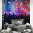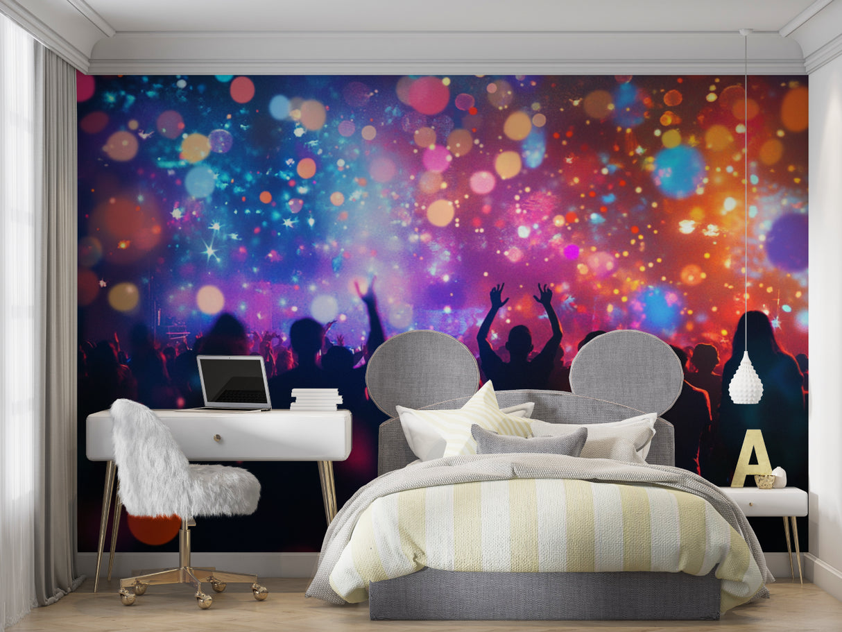 Ce papier peint de festival de musique capture l'atmosphère électrique d'un concert en direct avec son affichage hypnotisant de couleurs vibrantes et de lumières dansantes. L'effet bokeh céleste crée un auvent magique de bleus, violets et oranges chauds, tandis que des silhouettes tendent les bras vers un ciel rempli de effets lumineux de concert. Des étoiles et des orbes lumineuses parsèment le design, créant une atmosphère onirique et surnaturelle qui pulse au rythme et au mouvement.