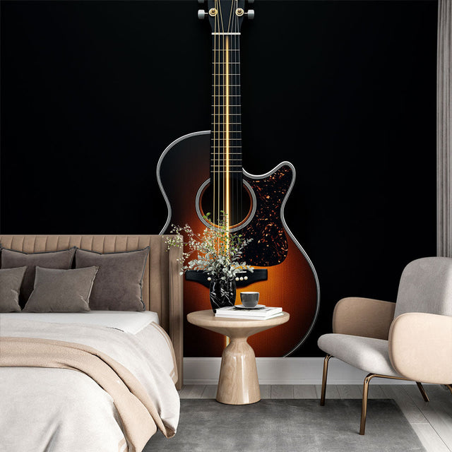 Cette fresque murale musicale présente une magnifique guitare acoustique aux riches tons sunburst, mise en valeur de manière spectaculaire sur un fond noir profond. Les courbes élégantes de l'instrument et ses détails sophistiqués brillent avec une précision photographique, du manche doré brillant à la plaque de protection en écaille de tortue. Un faisceau de lumière saisissant met en avant le design du papier peint guitare, créant un jeu artistique de lumière et d'ombre qui souligne le beau savoir-faire de l'instrument.
