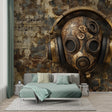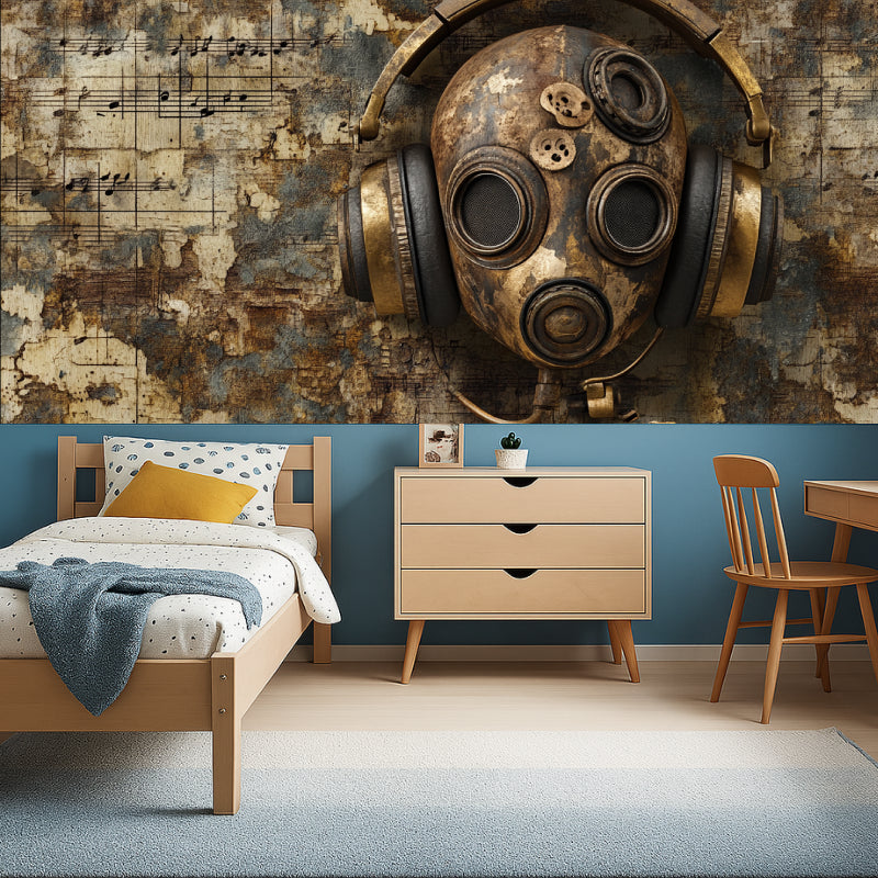 Cette peinture murale papier peint steampunk présente une puissante fusion du patrimoine industriel et de l'expression artistique. Le point central met en scène un masque à gaz usé orné de casques vintage, sur un fond texturé de partitions anciennes. La palette riche combine des tons bronze patinés avec des accents métalliques profonds, tandis que la peinture murale murale industrielle crée une atmosphère de sophistication mystérieuse grâce à ses éléments mécaniques détaillés.