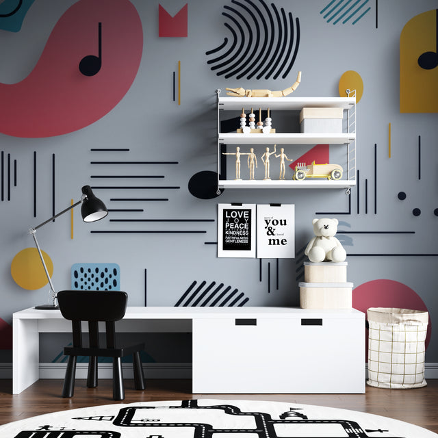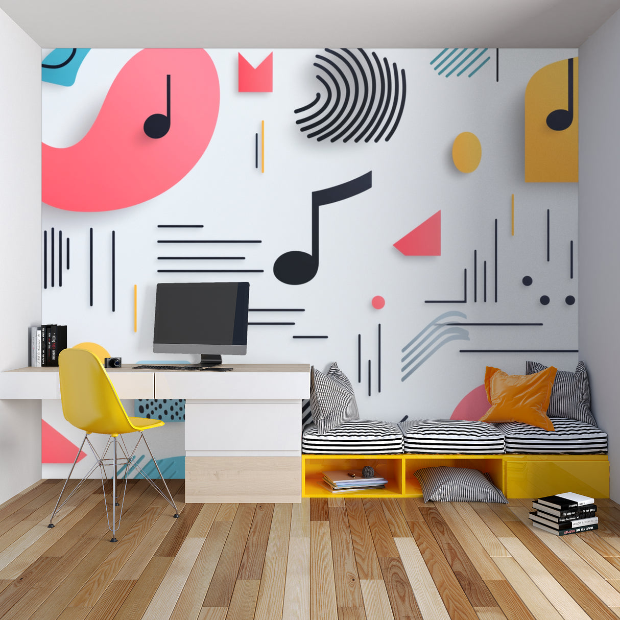 Ce papier peint à thème musical crée une symphonie visuelle dynamique avec sa composition géométrique ludique. Des notes de musique audacieuses dansent sur un fond gris doux, accompagnées de formes corail-rose, de cercles jaune moutarde et d'accents turquoise. Le papier peint abstrait moderne présente des lignes épurées et des motifs rythmiques qui s'écoulent harmonieusement sur le mur, créant une atmosphère sophistiquée mais énergique.