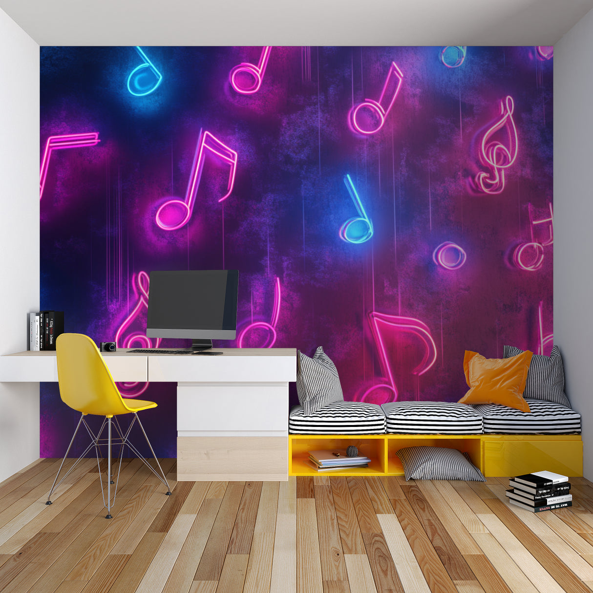 Transformez n'importe quel espace en un environnement dynamique avec ce design mural à thème musical. Parfait pour créer une atmosphère inspirante dans la chambre d'un adolescent, une salle de musique ou un studio créatif, ce papier peint artistique au néon ajoute une touche contemporaine tout en conservant un attrait sophistiqué. Le fond violet profond avec ses tourbillons cosmiques offre profondeur et dimension, rendant les espaces à la fois énergétiques et vastes.