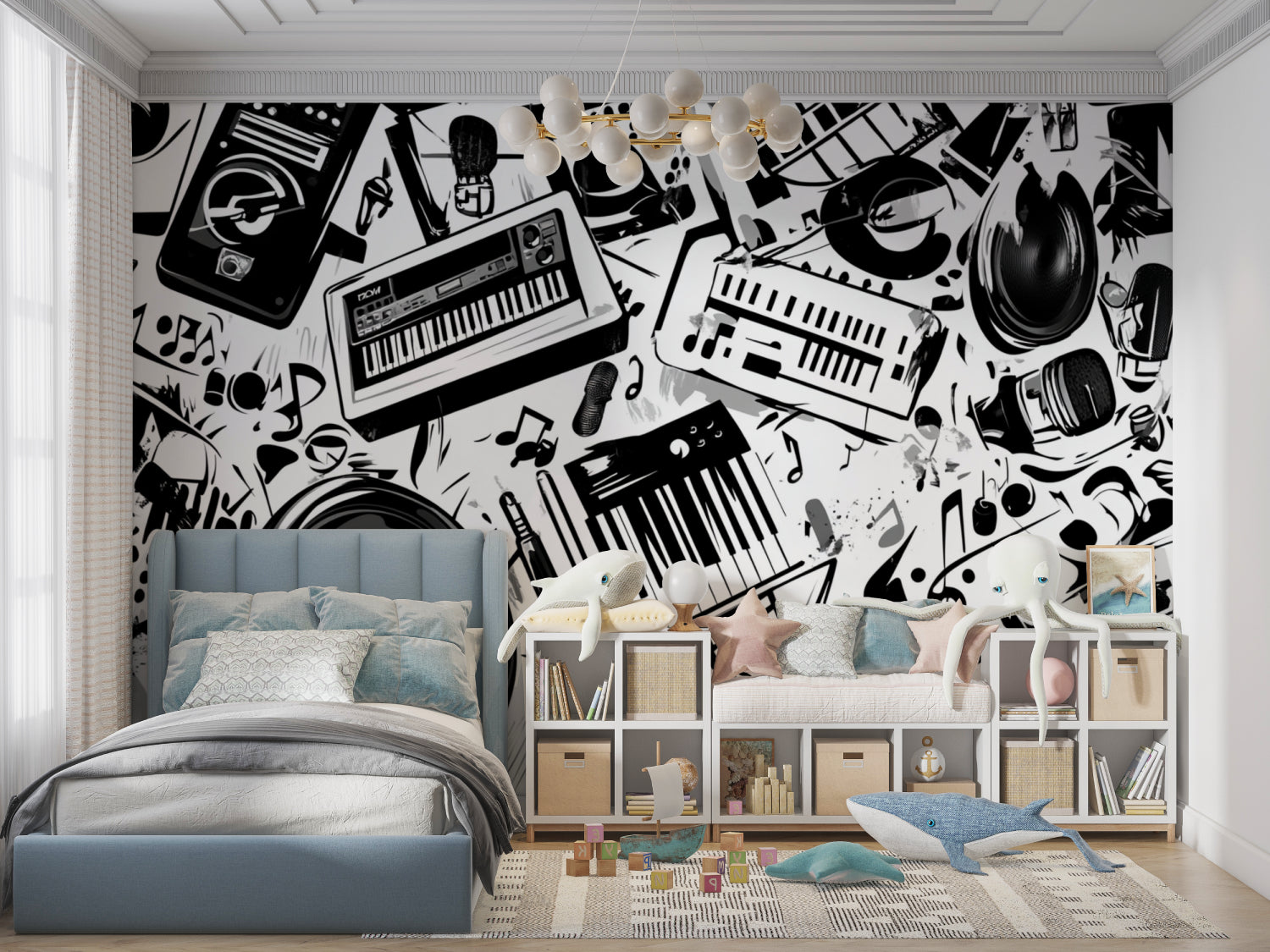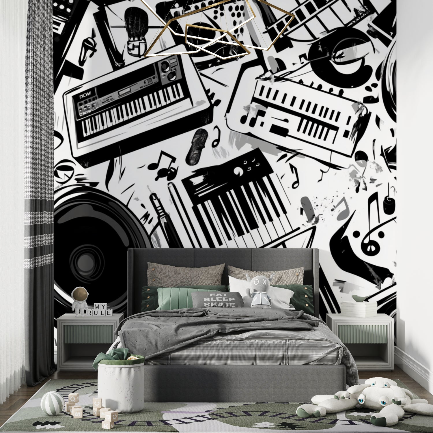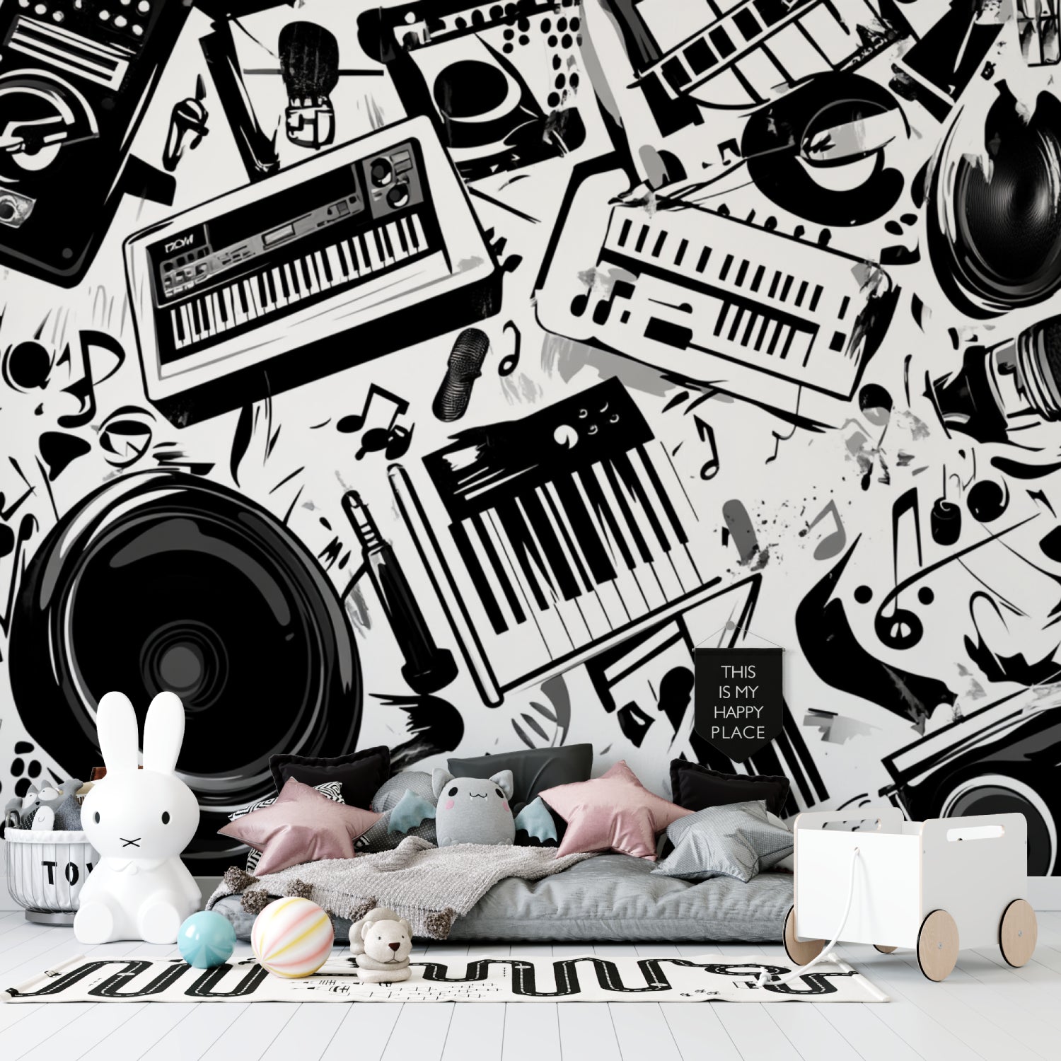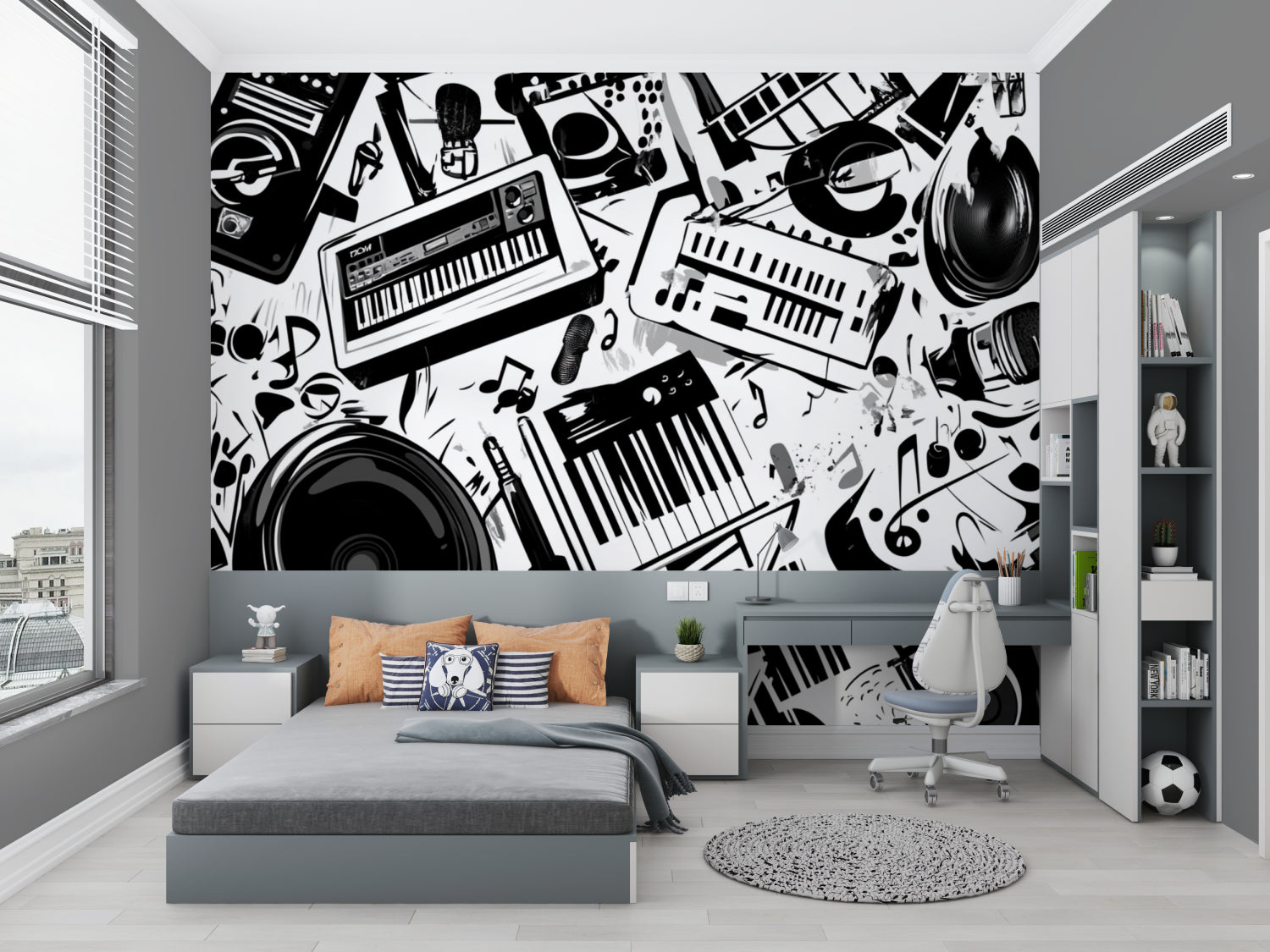 Ce papier peint à thème musical présente un collage dynamique d'instruments de musique et d'équipements en monochrome saisissant. Le design audacieux en noir et blanc met en scène des synthétiseurs vintage, des haut-parleurs, des microphones et des notes de musique disposés dans une composition abstraite et énergique. Chaque élément est rendu avec un détail précis, créant une fresque murale musicale moderne qui pulse au rythme et à l'harmonie visuelle.
