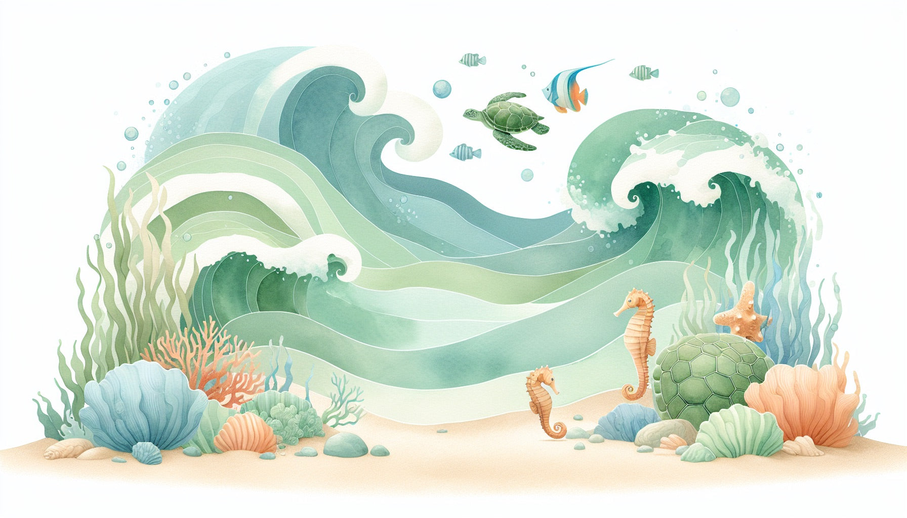 Ce papier peint à thème océan capture la beauté enchanteresse d'un paradis sous-marin rendu en douces nuances aquarelles. De gracieuses vagues turquoise dansent à travers le design, tandis que de délicates créatures marines donnent vie à la scène. Des formations de corail aux tons doux pêche et bleu créent un fond marin vibrant, complété par des algues ondulantes et des coquillages éparpillés. Le papier peint vie marine présente de charmants hippocampes, une douce tortue de mer et des poissons tropicaux nageant à travers des bulles cristallines.
