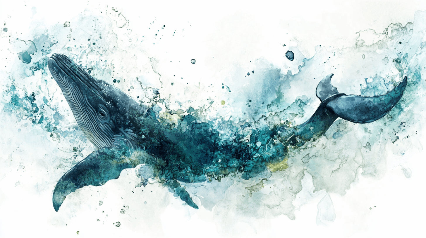 Ce papier peint à thème océan apporte la majesté de la vie marine dans votre espace à travers une composition aquarelle époustouflante. Le doux géant de la mer émerge des vagues tourbillonnantes aqua et turquoise, créant une atmosphère sous-marine de rêve. Le mélange artistique de bleus profonds et de teintes douces de sarcelle, accentué par de délicats nuages blancs, forme un papier peint marin qui capture l'essence de la sérénité océanique.