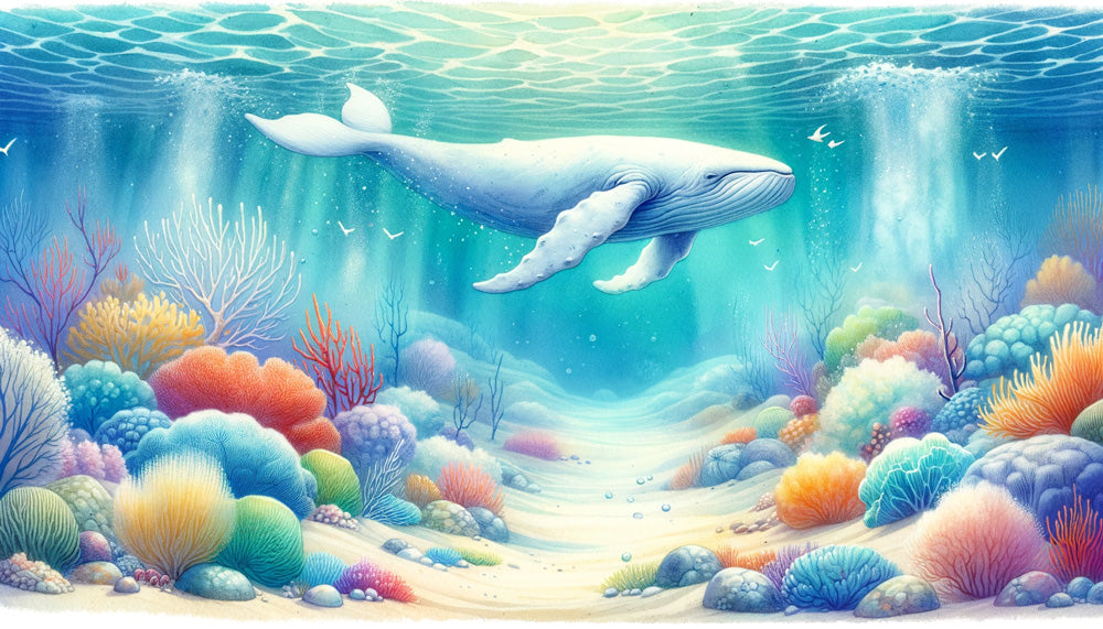 Regardez la douce baleine bleue vous guider à travers un paysage marin de rêve.