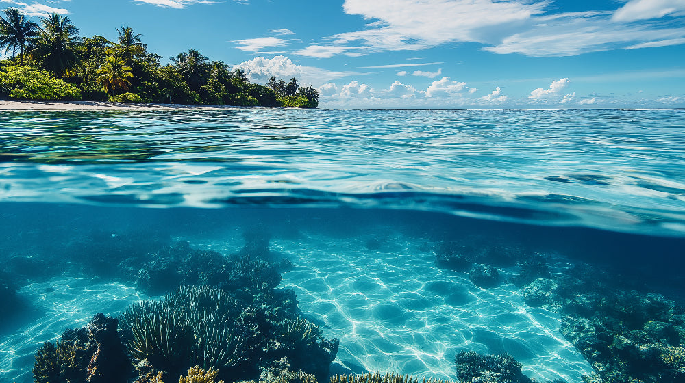 Ce papier peint océan tropical capture une perspective fascinante en vue partagée où deux mondes se rejoignent en parfaite harmonie. Les eaux turquoise cristallines s'étendent à l'infini vers l'horizon, rencontrant un ciel bleu vibrant parsemé de nuages blancs comme du coton. Sous la surface, un spectaculaire papier peint récif corallien sous-marin révèle un paysage marin enchanteur où la lumière du soleil danse à travers les profondeurs azurées, illuminant des formations coralliennes délicates et créant des motifs lumineux éthérés sur le fond de l'océan.