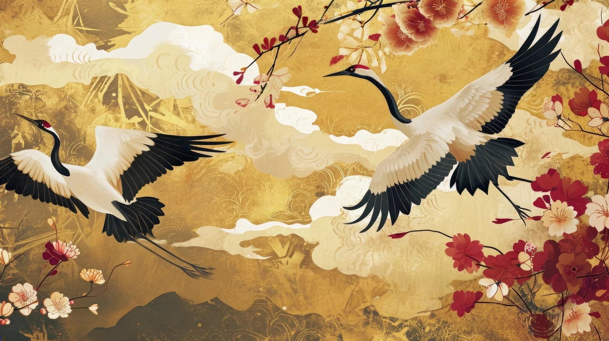 Ce papier peint grue japonaise capture l'essence de l'art asiatique traditionnel avec des oiseaux majestueux en vol gracieux. Sur un fond doré lumineux, des grues noires et blanches planent sous de délicates branches de fleurs de cerisier, leurs ailes déployées avec un détail élégant. Les riches fleurs cramoisies et les nuages éthérés créent une composition harmonieuse, tandis qu'un sommet montagneux lointain ajoute de la profondeur à ce design oriental sophistiqué.