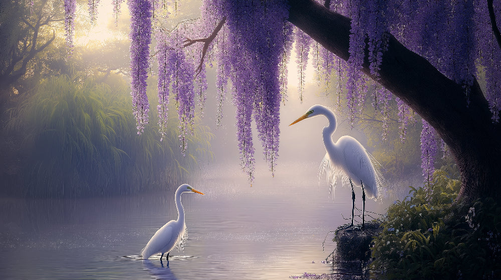 Papier Peint Mural Oiseaux | Hérons Blancs et Glycine Pourpre au Lac