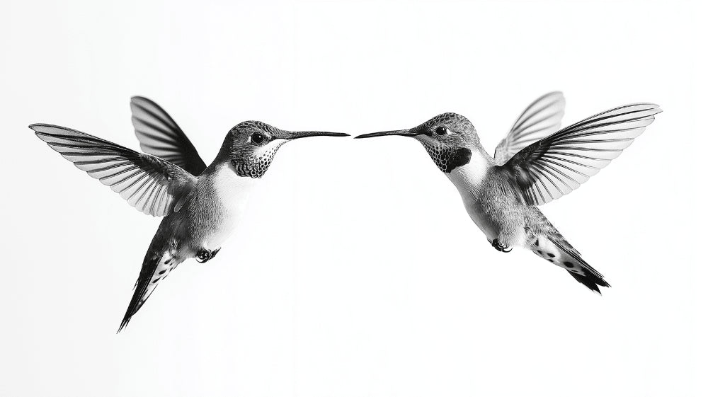 Ce papier peint oiseau noir et blanc sophistiqué capture deux colibris dans un moment intime, leurs becs se rencontrant dans une démonstration gracieuse de chorégraphie naturelle. La palette monochromatique met en valeur chaque détail complexe, des plumes délicatement rendues aux motifs précis des ailes, créant une fresque murale de colibri qui attire l'attention tout en conservant une élégance discrète. Le fond blanc net amplifie le contraste dramatique, permettant à chaque détail nuancé d'émerger avec une clarté photographique.