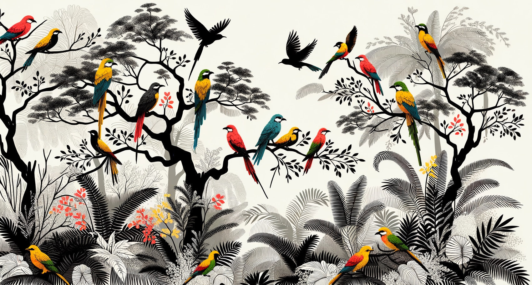 Papier Peint Mural Oiseaux | Paradis Tropical avec Arbres Noirs