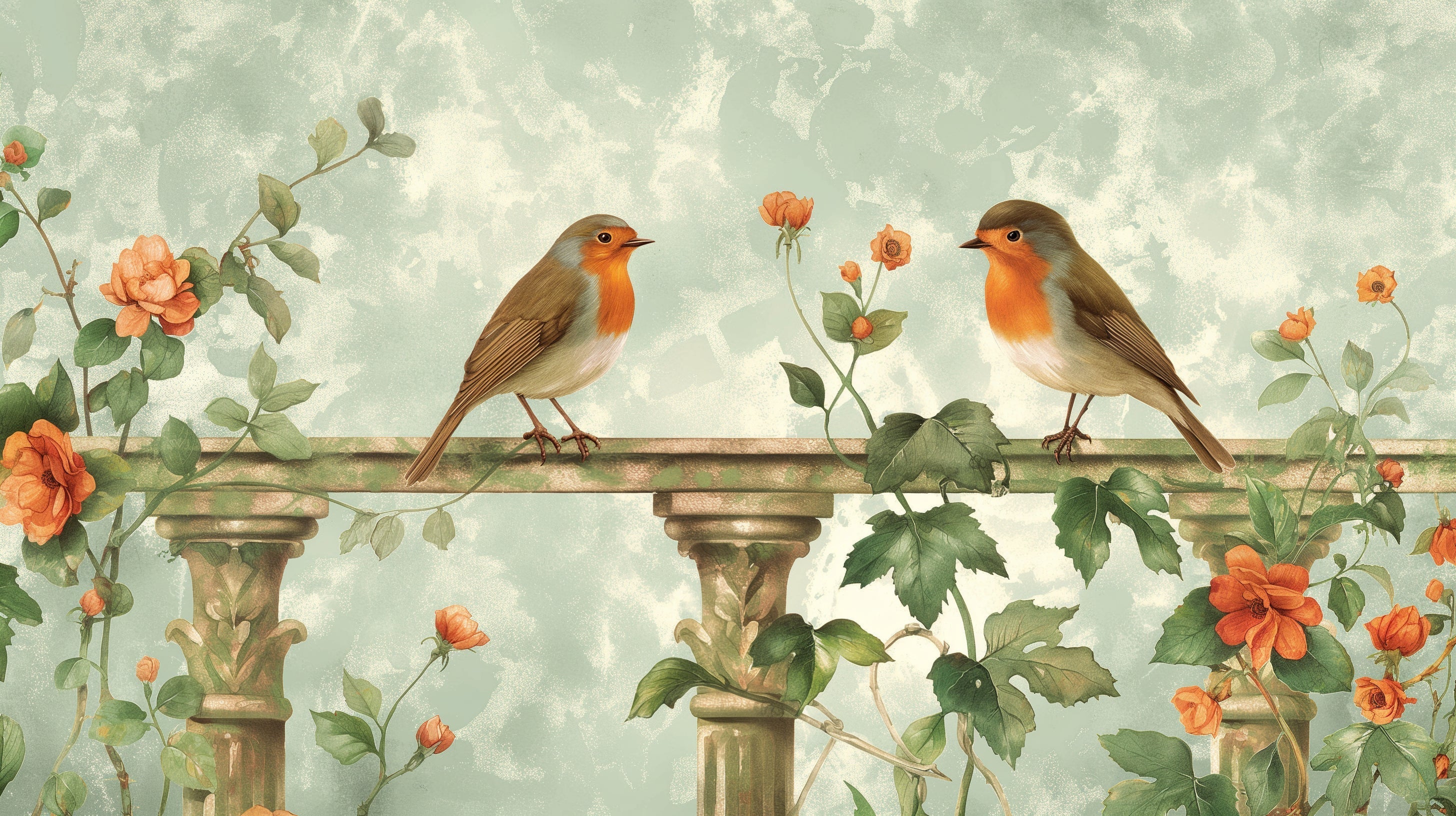 Ce papier peint oiseaux de jardin capture un moment serein où deux rouges-gorges se reposent sur une élégante balustrade en pierre, créant une scène pastorale captivante. Le ciel vert sauge doux offre un arrière-plan onirique tandis que des roses corail-orange grimpent gracieusement parmi des feuilles émeraude. Chaque détail est rendu avec une précision artistique, des poitrines orange distinctives des rouges-gorges aux pétales délicats du design de papier peint floral vintage, créant un mélange harmonieux d'éléments naturels.