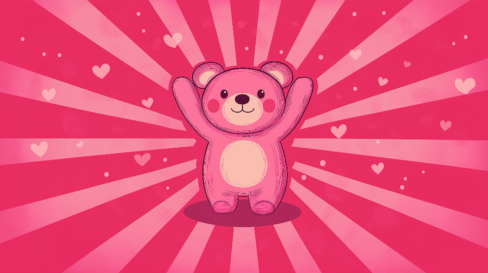 Ce charmant papier peint ours en peluche présente un adorable personnage d'ours rose sur un fond éclatant en rayons de soleil. Le design met en scène un ours joyeux aux bras levés, aux joues roses et au sourire doux, entouré de délicats cœurs flottants et de points. Les rayons dynamiques en dégradé du rose au rouge créent un arrière-plan joyeux et énergique qui fait vraiment vivre la fresque murale ours rose avec chaleur et espièglerie.