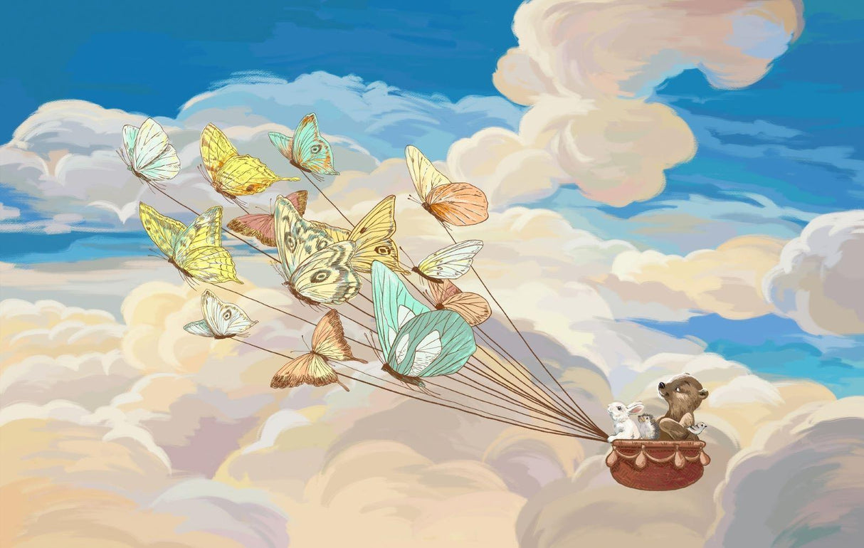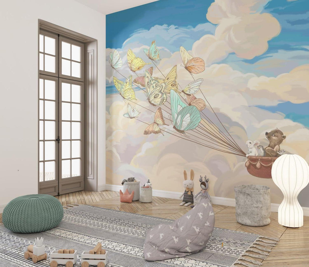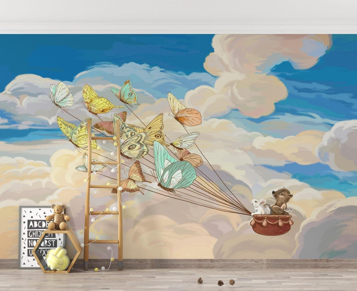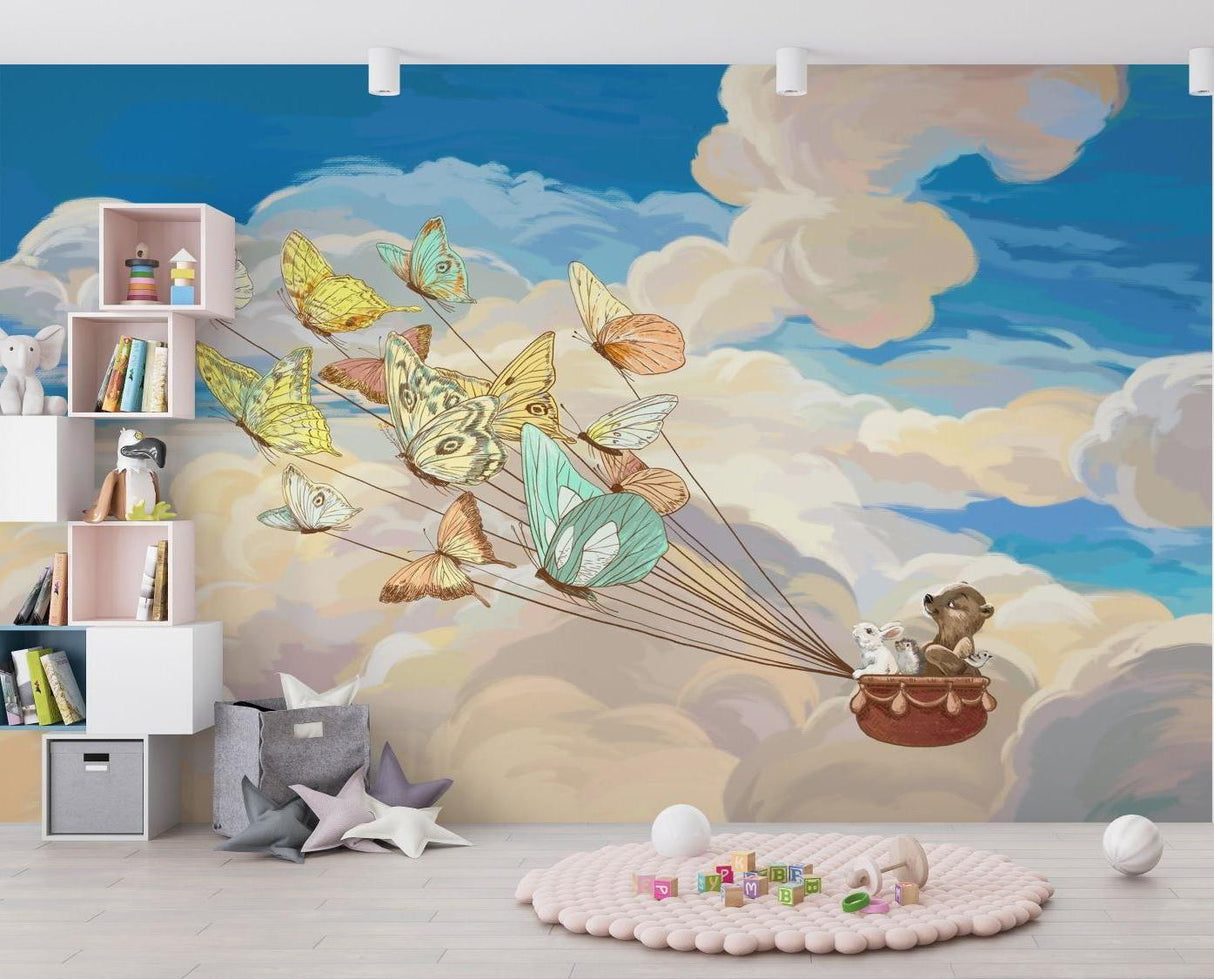 Ce papier peint enfant fantastique capture une aventure fantaisiste dans les nuages, où de délicats papillons aux teintes douces de menthe, corail et jaune transportent un charmant duo de créatures forestières à travers un ciel de rêve. Le design artistique présente une art mural papillon magnifiquement détaillée sur un fond de nuages moelleux couleur crème et de ciels bleus vibrants, créant une scène captivante qui stimule l'imagination et l'émerveillement.