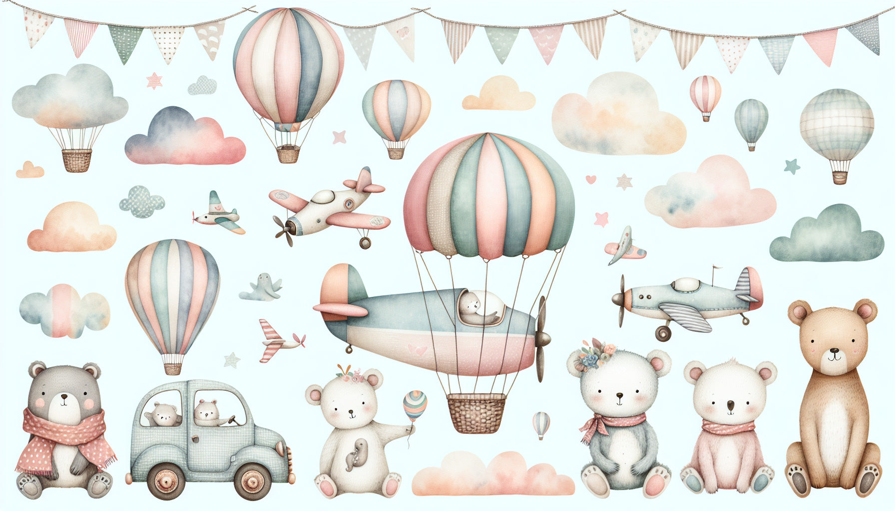 Ce papier peint mural pour chambre de bébé enchanteur crée un pays des merveilles fantaisiste où des montgolfières aux teintes douces dansent parmi des nuages de barbe à papa. D'adorables ours en peluche partent en voyages magiques dans des voitures vintage et des embarcations flottantes, tandis que des avions joueurs s'élèvent dans le ciel doux. La palette délicate d'aquarelle rose, vert sauge et bleu poudré donne vie à un papier peint pastel pour chambre de bébé avec sa sophistication rêveuse.