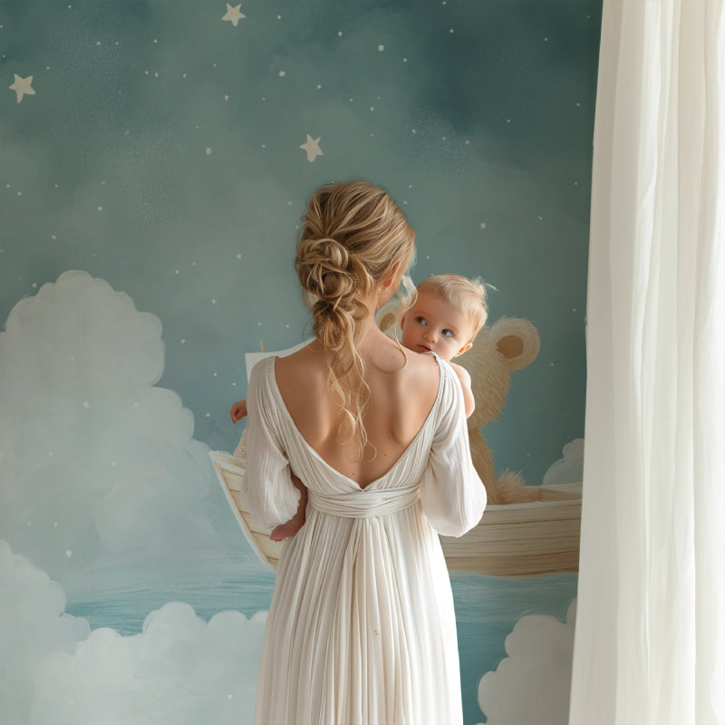 Ce papier peint pour chambre de bébé enchanteur dépeint une scène charmante d'un doux ours en peluche naviguant à travers un ciel étoilé. Sur un fond bleu sarcelle serein, des nuages blancs et duveteux dérivent paisiblement tandis que des étoiles argentées scintillent au-dessus. Le bateau en bois, avec son petit drapeau blanc, ajoute une touche fantaisiste à cette fresque murale pour enfants, créant une atmosphère maritime de rêve qui capture l'essence de la merveille de l'enfance.