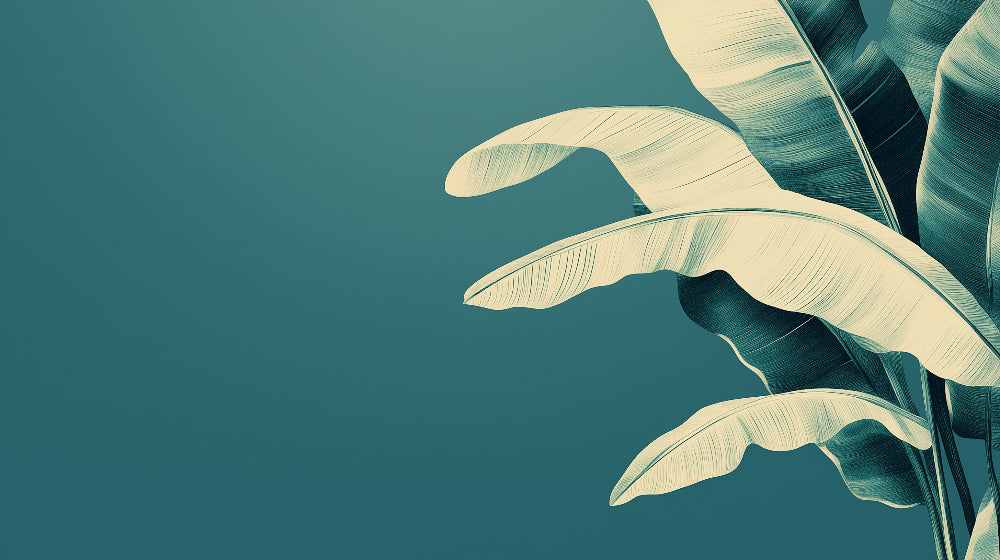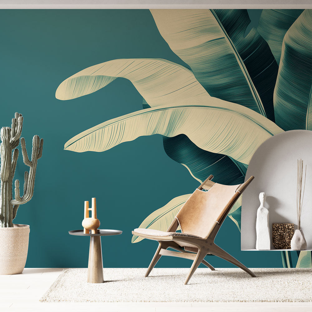 Papier Peint Mural Tropical | Feuilles de Banane sur Fond Bleu Sarcelle