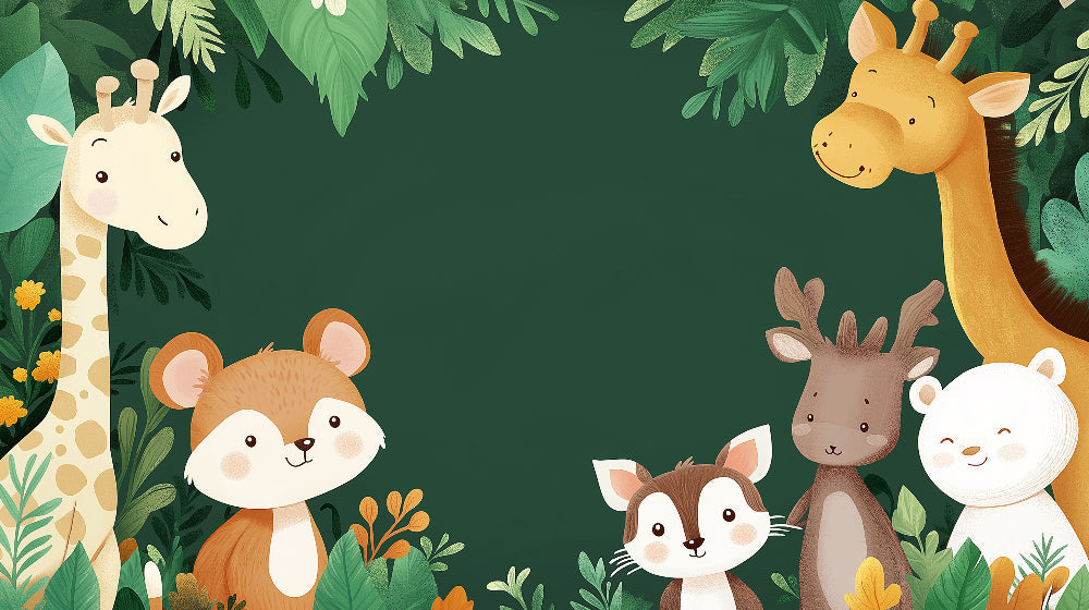 Ce papier peint animaux de la forêt crée une scène forestière enchantée où des personnages charmants prennent vie sur un riche fond émeraude. Les expressions douces de la girafe, du renard, du cerf et de l'ours sont rendues dans des tons doux et apaisants, tandis que des feuilles tropicales verdoyantes encadrent la composition. Chaque détail du papier peint créatures de la forêt est soigneusement illustré dans un style doux et adapté aux enfants qui capture l'essence magique d'une réunion en forêt.