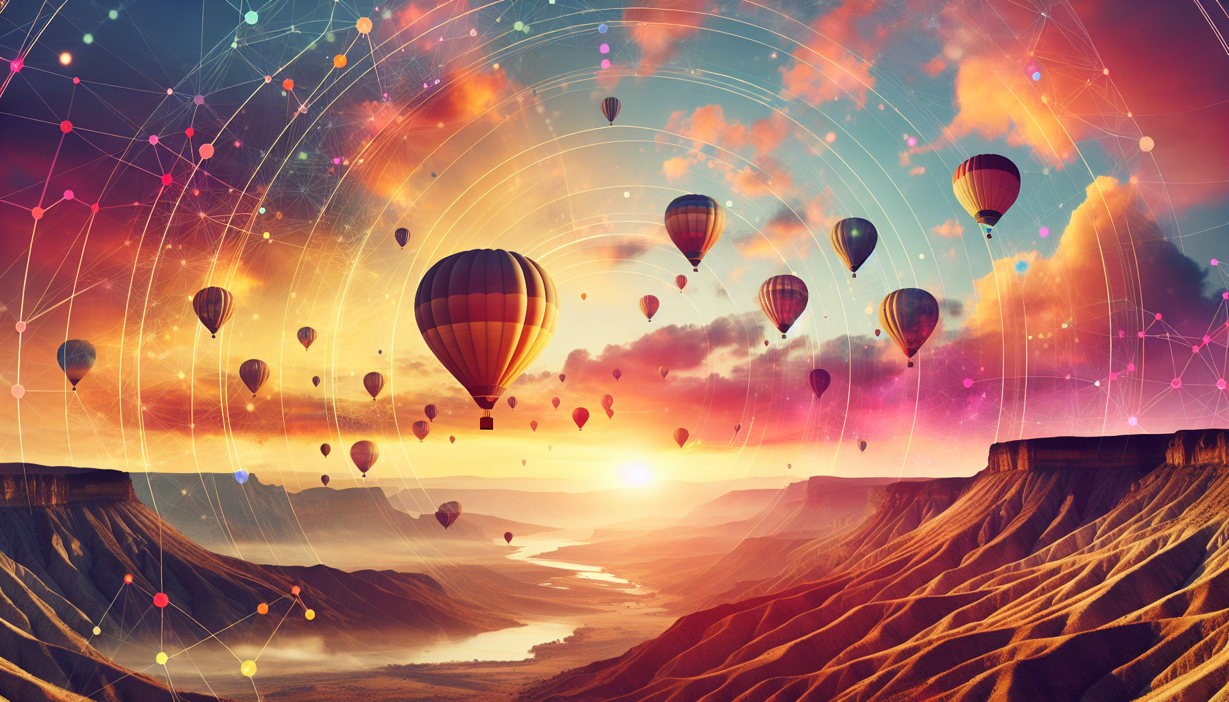 Ce papier peint montgolfière capture un spectacle de coucher de soleil fascinant où des ballons vibrants flottent contre un ciel onirique. Le paysage panoramique présente des formations majestueuses de canyon baignées de teintes doré-orange, tandis qu'une rivière sinueuse reflète la lumière chaude du soleil en dessous. De délicats motifs géométriques lumineux dansent sur la toile céleste, créant une atmosphère éthérée alors que les ballons colorés dérivent paisiblement à travers des nuages blancs comme du coton.